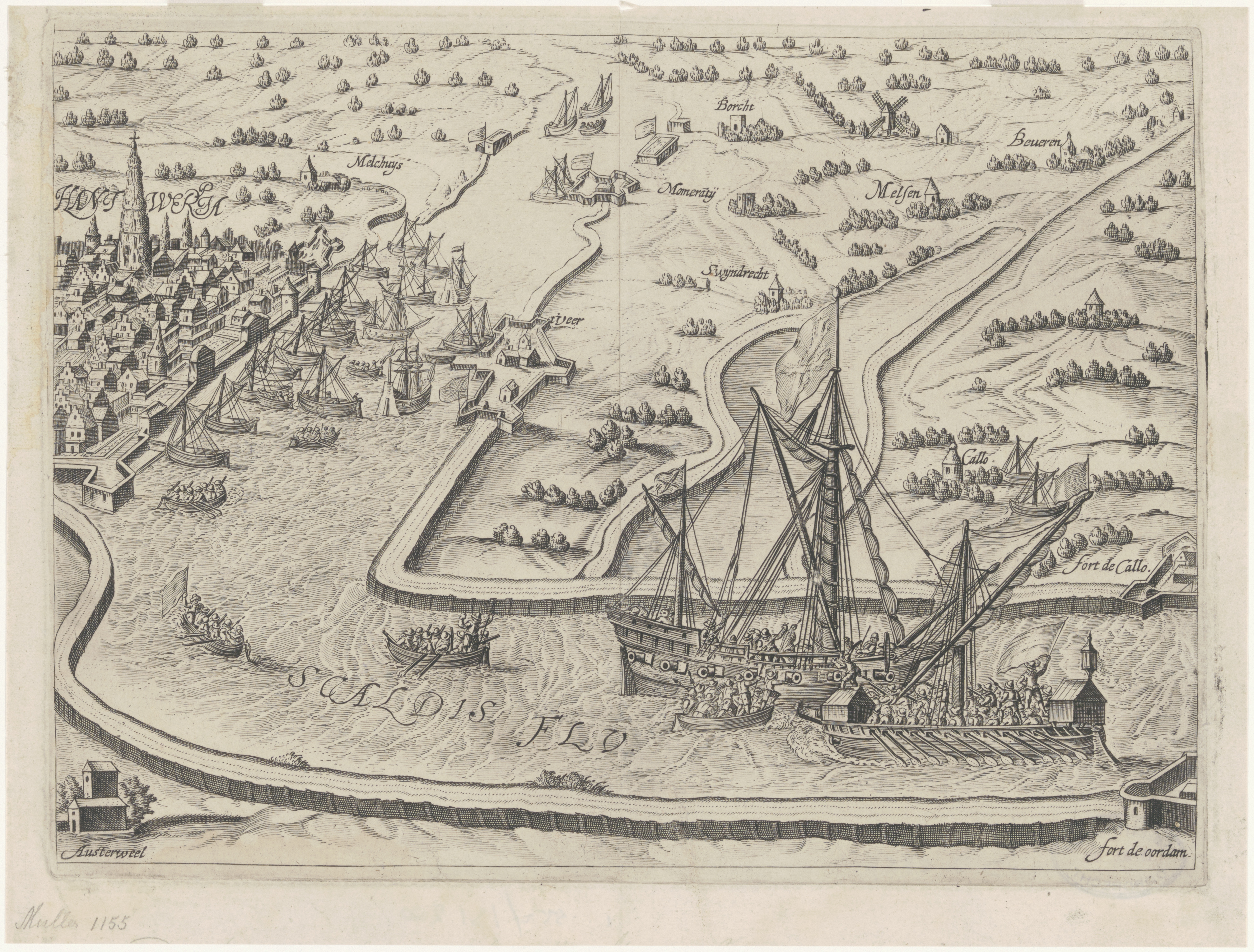 - Vogelvlucht van Antwerpen e.o. waarin uitgebeeld De Zwarte galei van Dordrecht welke voor Antwerpen een achttal schepen, waaronder het Spaanse Admiraalsschip, neemt.