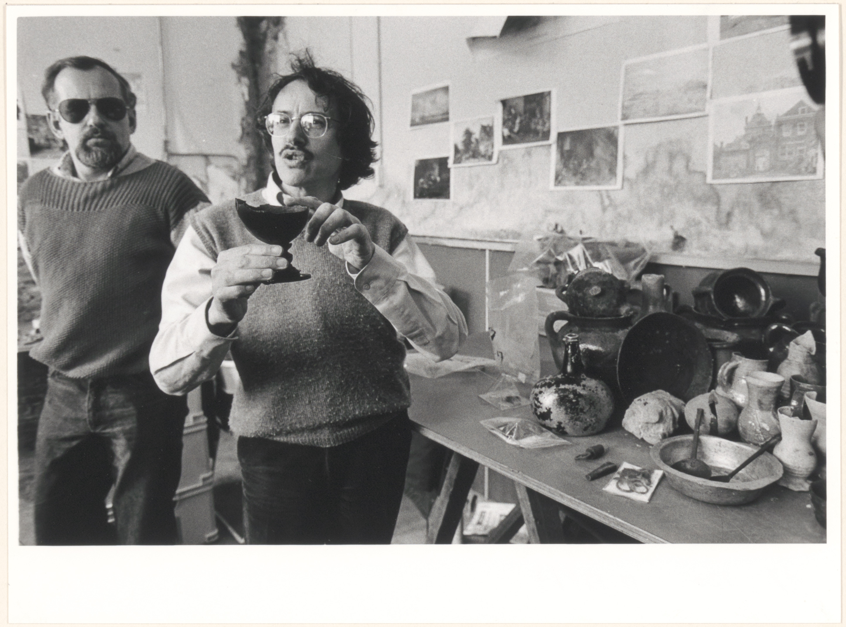 - Archeoloog H. Sarphatij toont tijdens een persconferentie een vondst uit een beerkelder onder de Waag: een halve kokosnoot op houten voet; in de Twentse Bank op het Scheffersplein, die als werk-, opslag- en expositieruimte dienst doet.