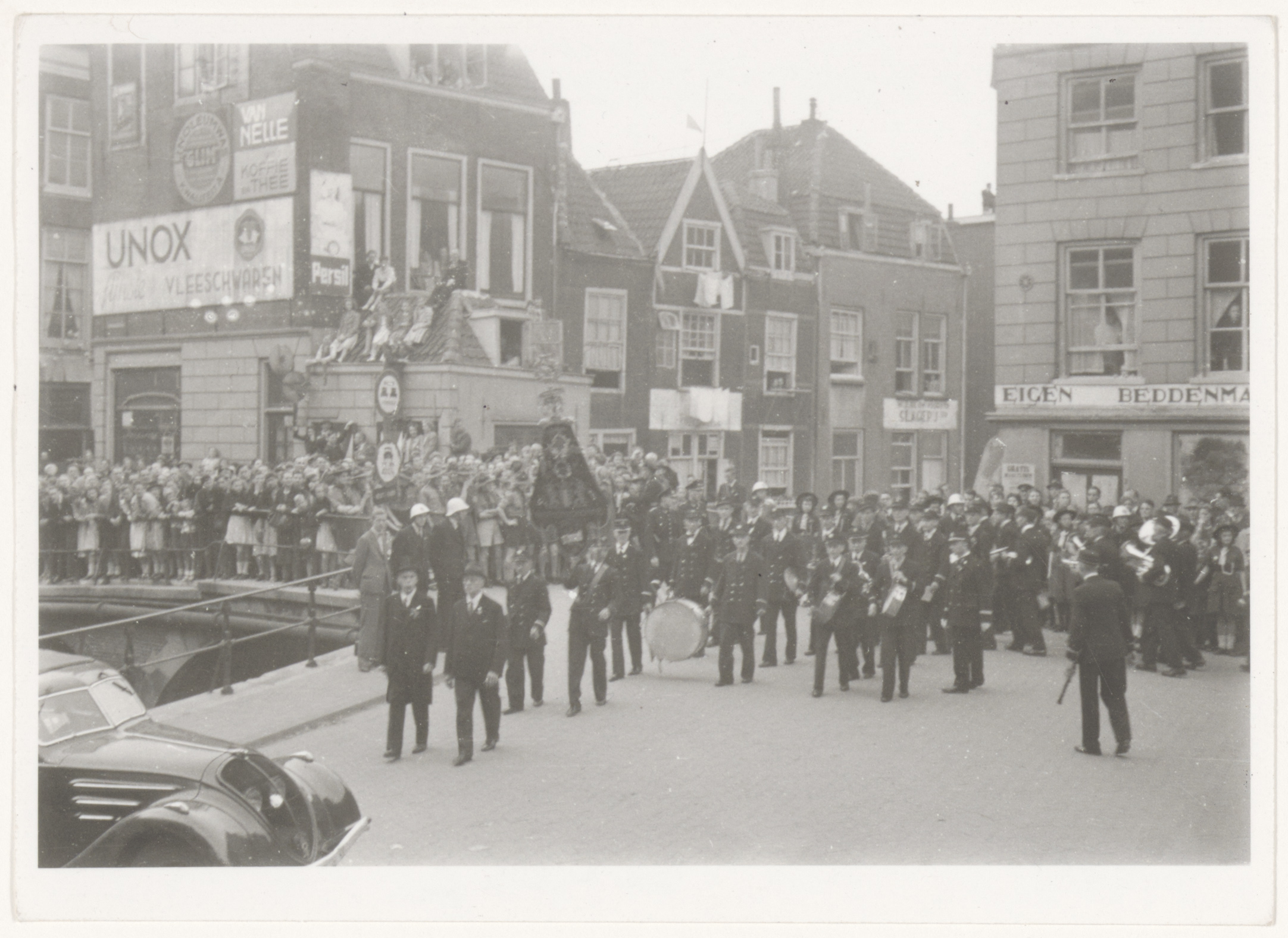 - bevrijding gevelreclame muziekkorpsen publiek / toeschouwers