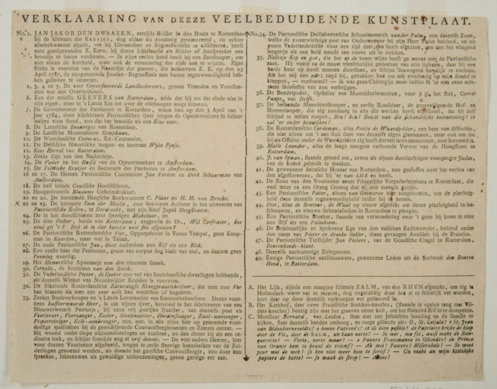 Verklaring bij de spotprent op de vlucht van Rijngraaf van Salm, bevelhebber van patriotische troepen in Utrecht toen de Pruisen naderden, in de nacht van 15 naar 16 september 1787. De voorstelling toont een zalm die door zes, als vrijcorpisten geklede, keeshonden wordt begraven, gevolgd door een menigte patriotten.