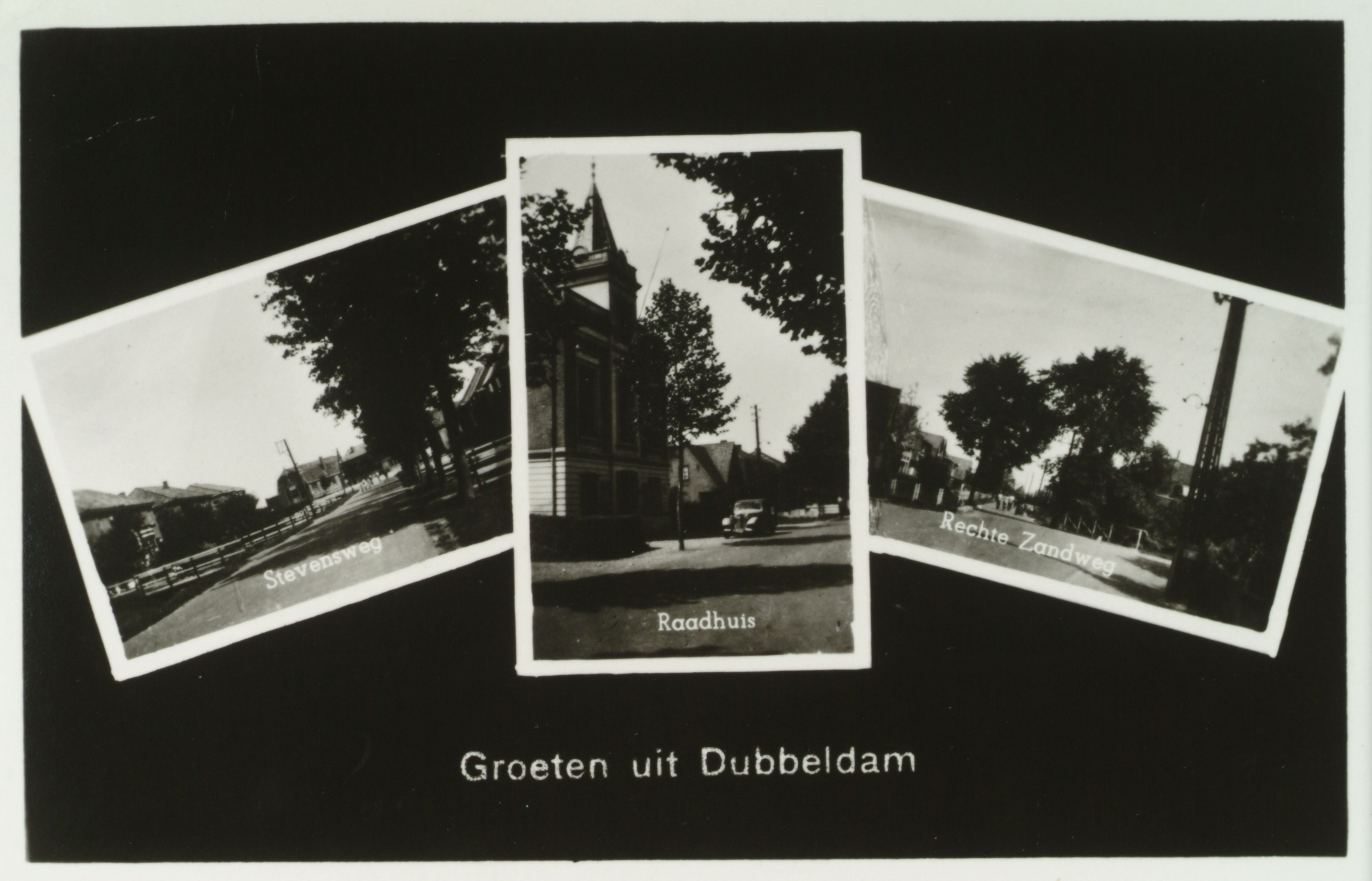 - Groeten uit Dubbeldam, v.l.n.r. Stevensweg, Raadhuis aan de Dubbelsteynlaan West en de Rechte Zandweg.