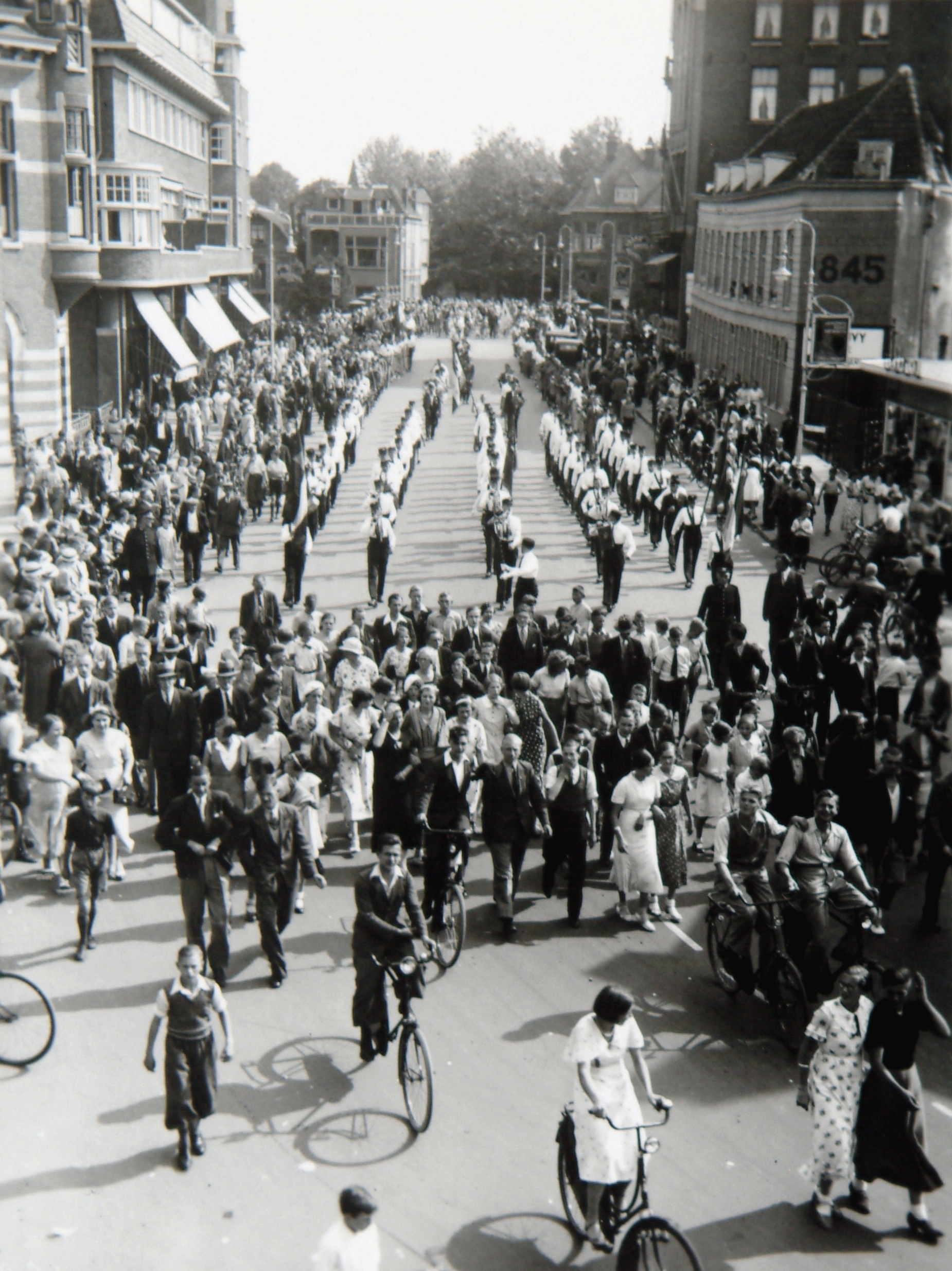 - Intocht van deelnemers aan de Vierdaagse van Nijmegen. De stoet loopt in de Johan de Wittstraat en buigt rechtsaf naar het Bagijnhof.