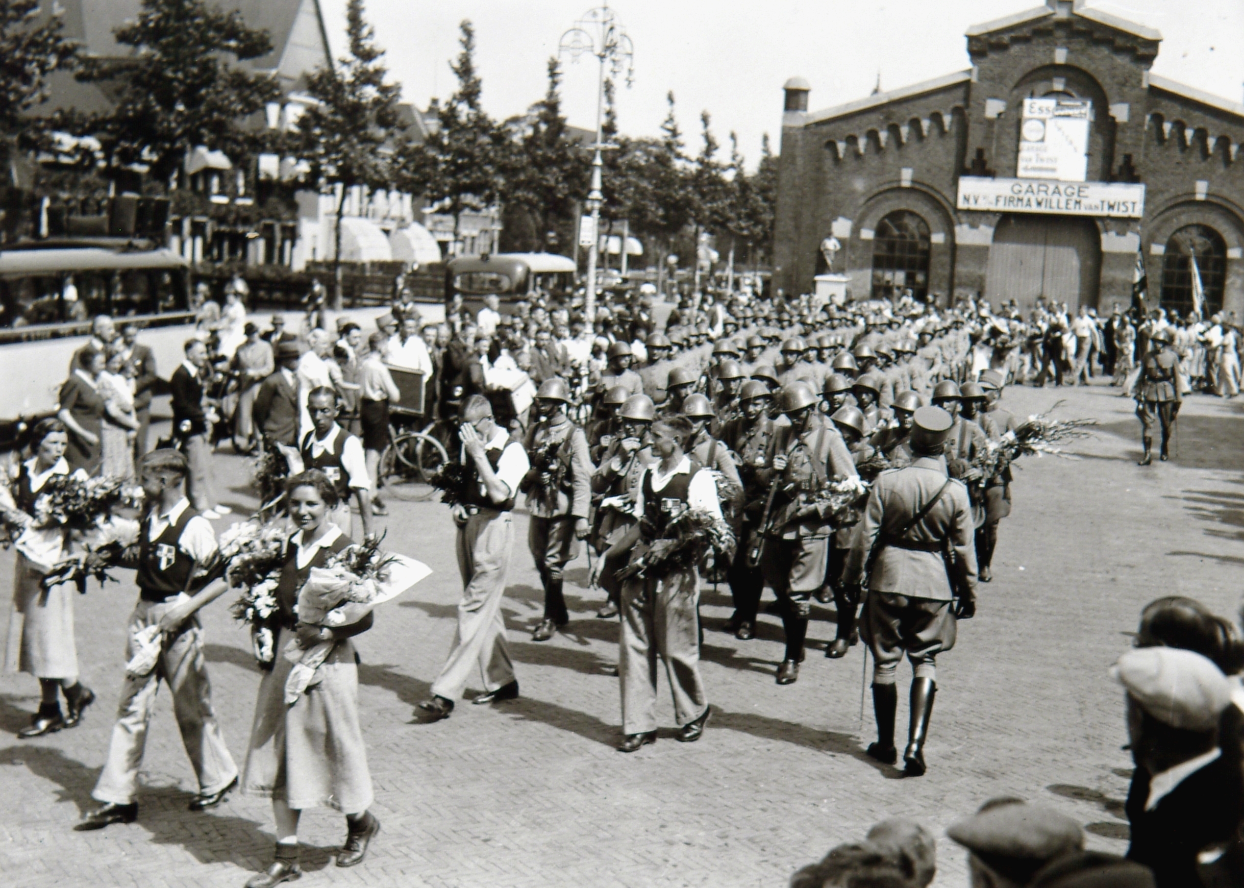 - Aankomst van deelnemers aan de Vierdaagse in Nijmegen op het Stationsplein in Dordrecht. Voorop een wandelclub, daarachter een groep pontonniers.