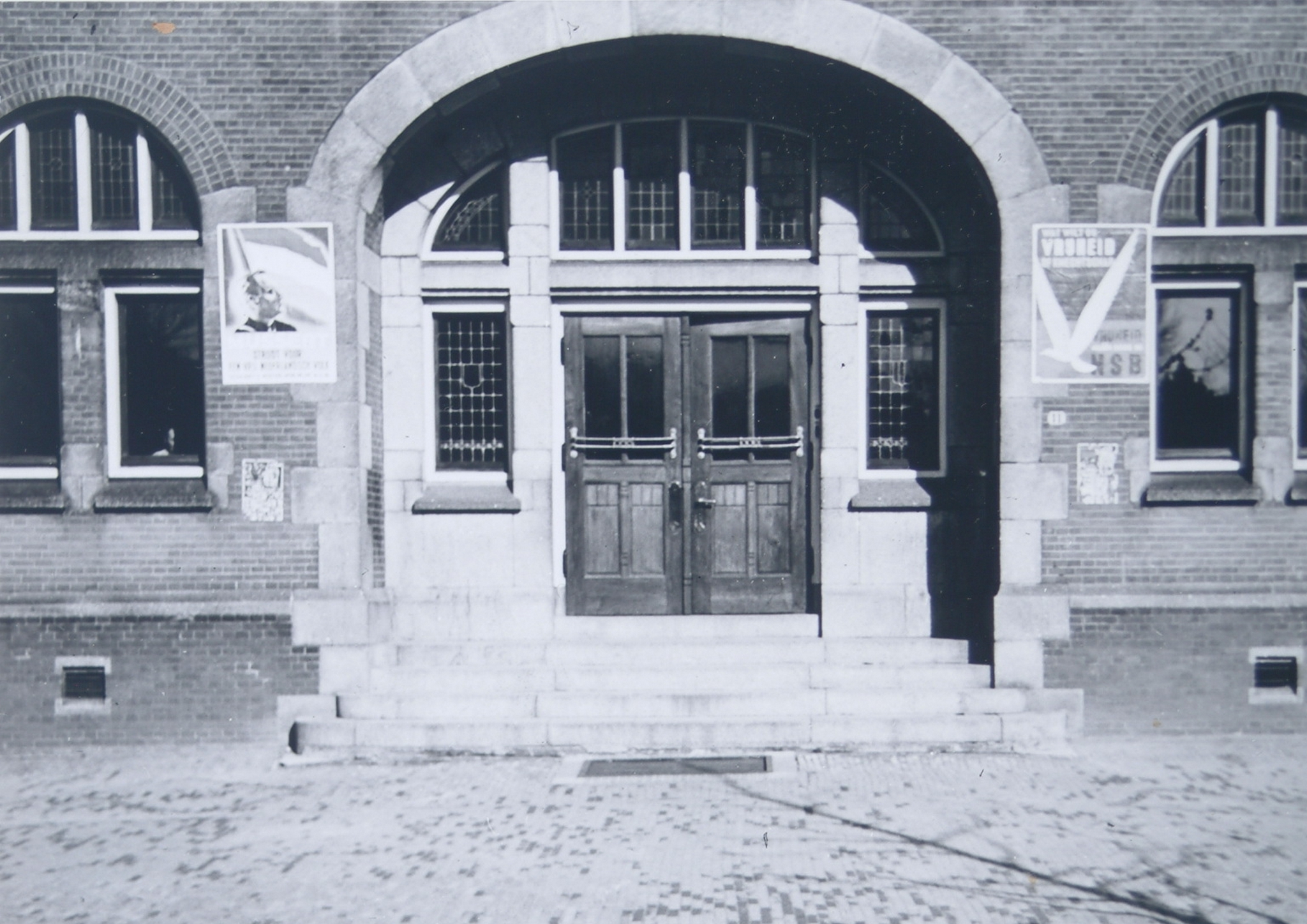 Affiches met Duitse propaganda geplakt aan de gevel van de HBS aan het Oranjepark