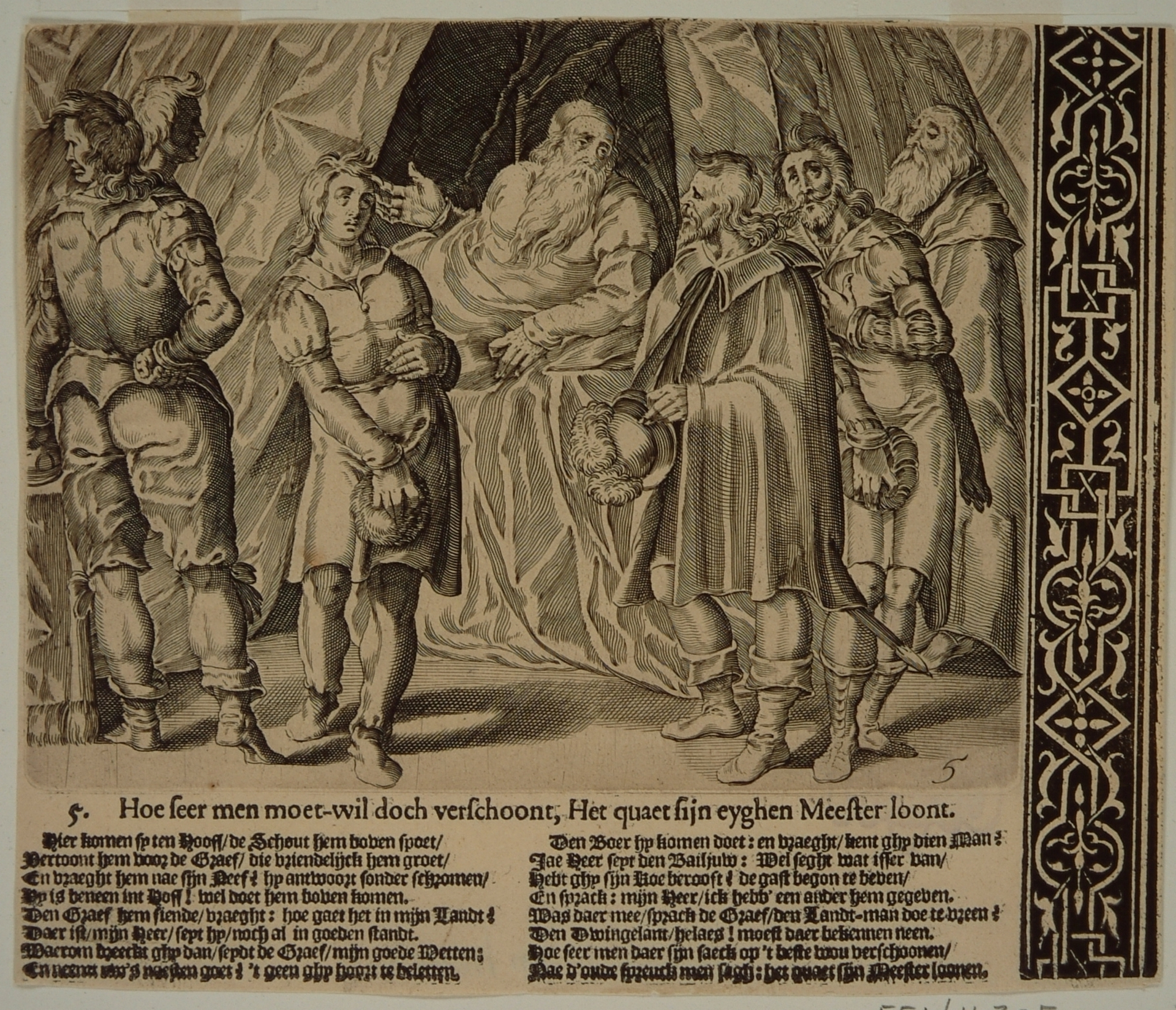 - Detailprent van een plaat over de justitie van Graaf Willem III in 1336, waarbij de graaf het vonnis uitroept in zijn bed