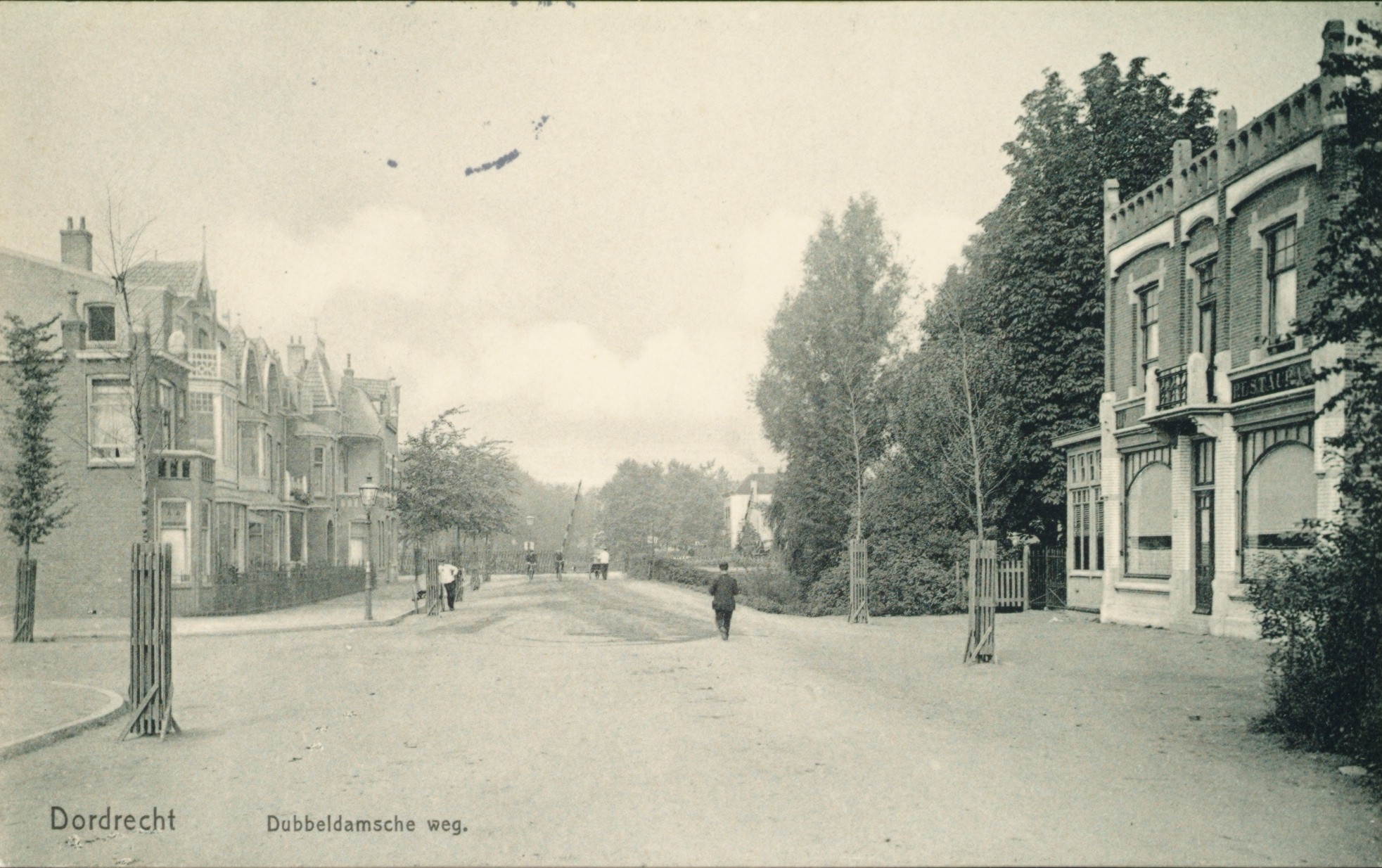 - Dubbeldamseweg Zuid vanaf de Mauritsweg (links) naar de spoorwegovergang. Rechts een café.