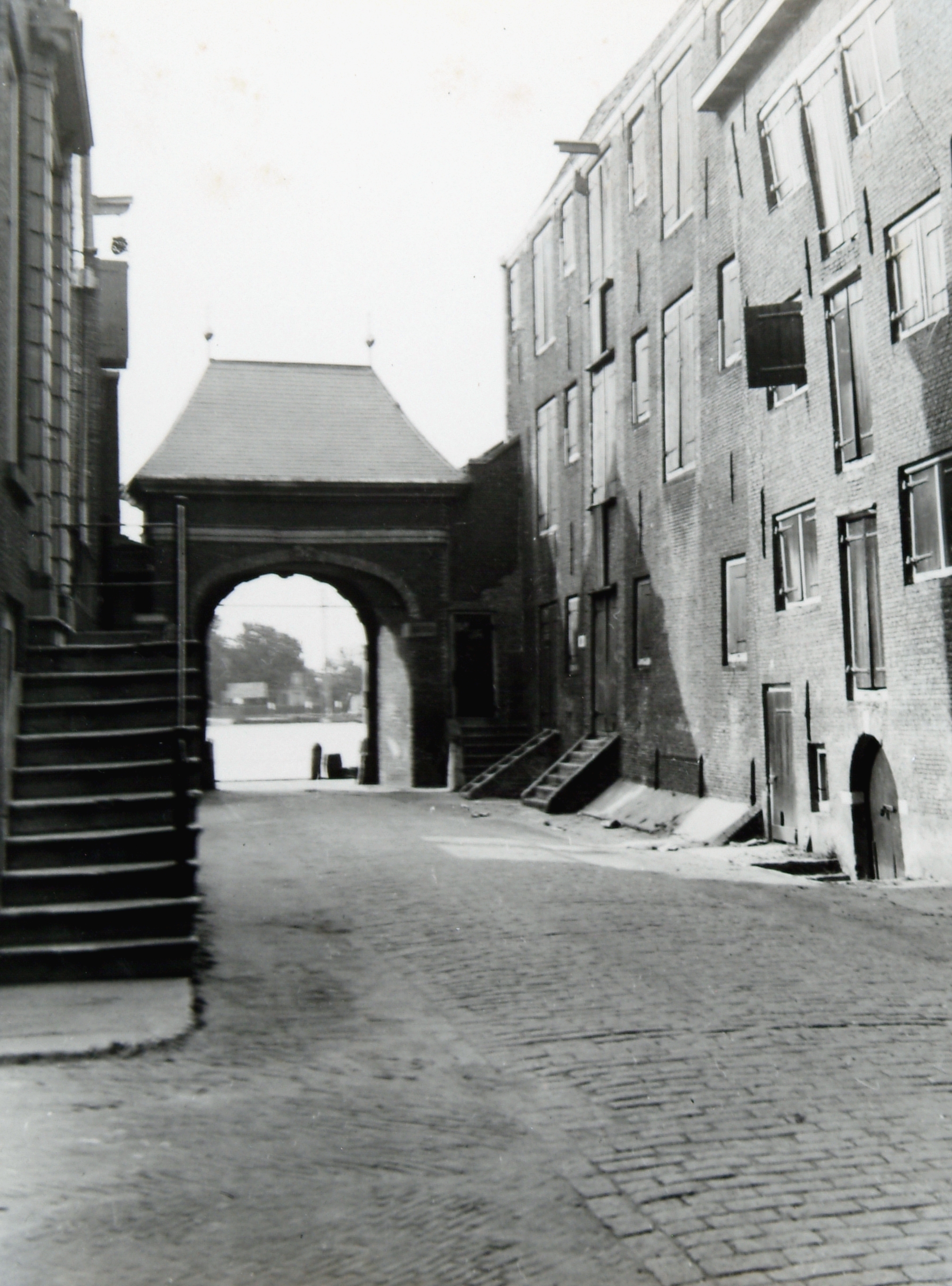 - De Korte Engelenburgerkade richting Catrijnepoort met een doorkijkje naar Zwijndrecht. Rechts de pakhuizen Engeland en Rusland.