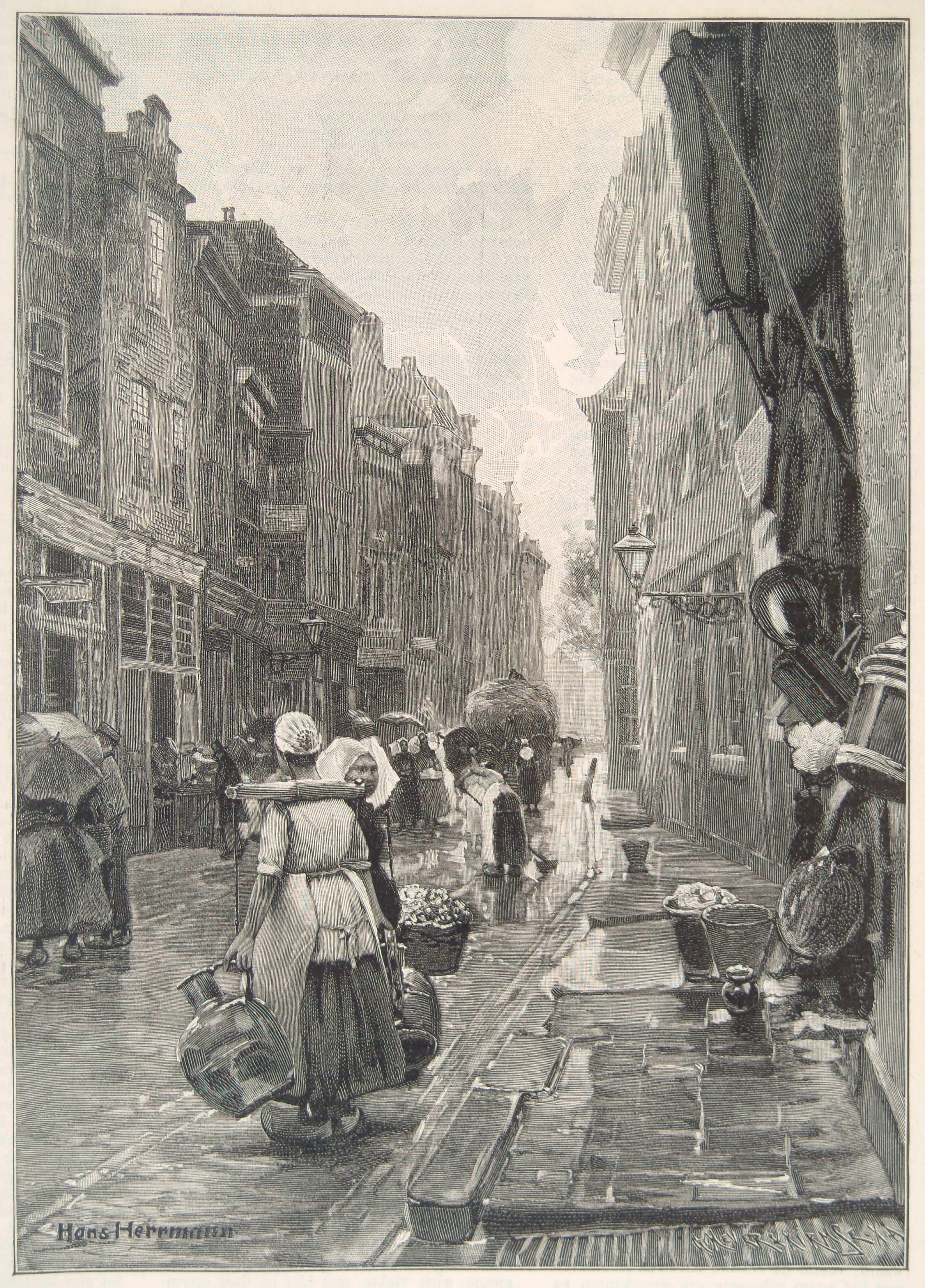 - Gezicht in (waarschijnlijk) de Voorstraat, met dames met een juk met melkkannen en groentemanden.