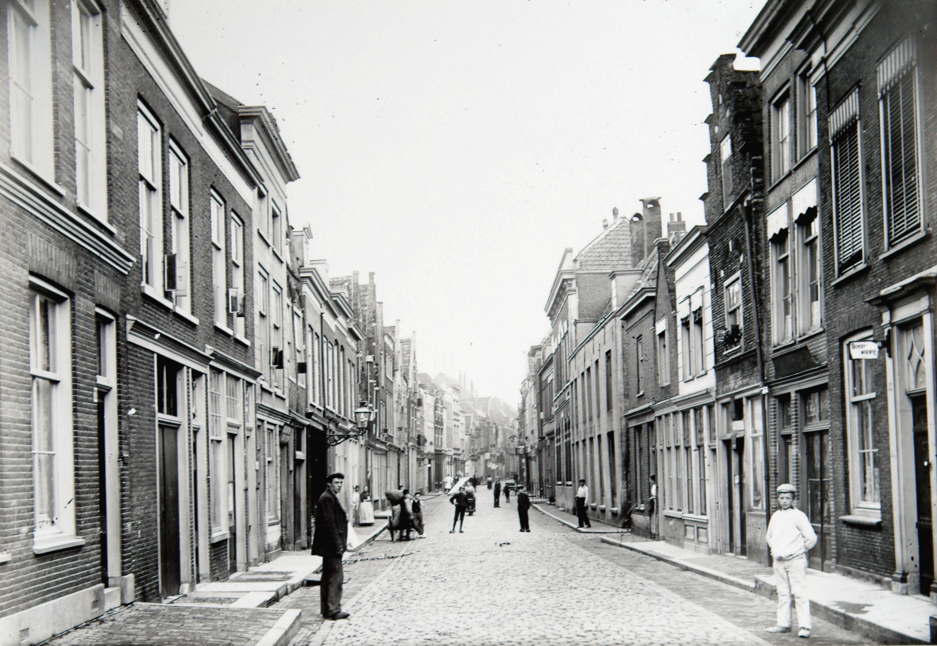 - Nieuwstraat gezien vanaf de Museumstraat, richting Voorstraat. Het uithangbordje rechts vermeldt dat de bovenwoning te huur is. De toegang tot de Augustijnenkamp is heel smal. Om deze te verbreden zal het pand rechts achter het hekje afgebroken worden.
