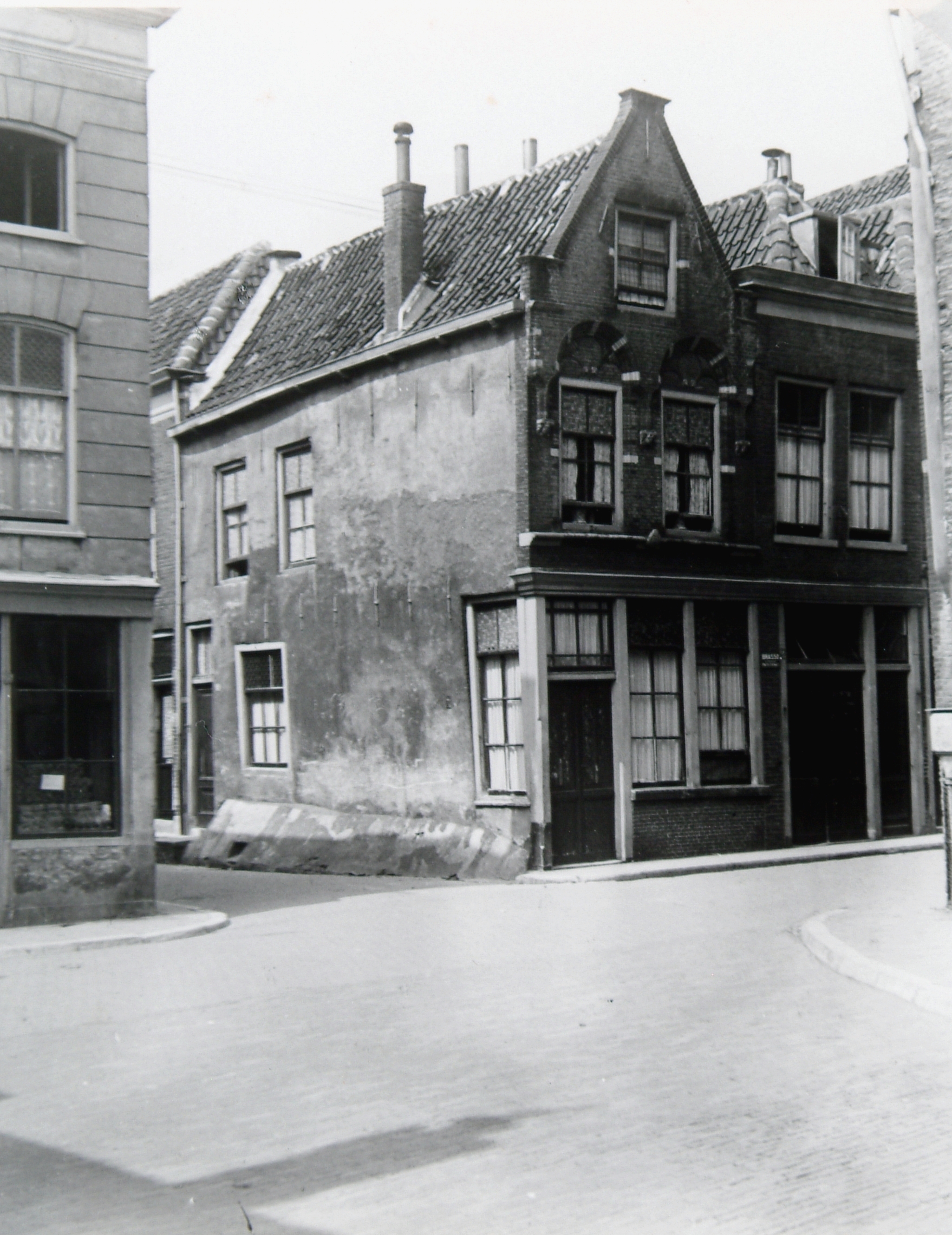 Hoek Nieuwstraat/Steenstraat gezien vanaf de Hofstraat. Naar rechts is richting Voorstraat. Het stukje muur uiterst rechts is van gebouw Berckepoort. In het huis links op de hoek zijn de eerste ontmoetingen gehouden van het Nederlands Leger des Heils.