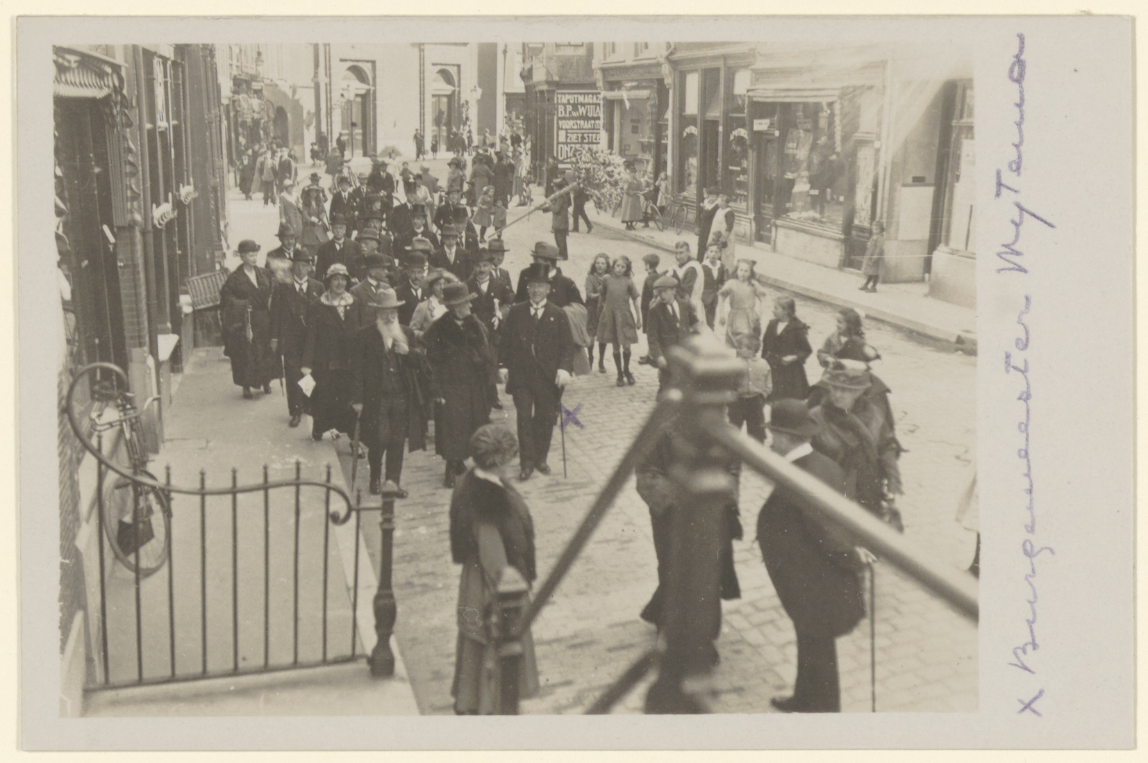 - De Voorstraat richting Augustijnenkerk vanaf de trap van gebouw Pictura. Een gezelschap waaronder de met een kruisje aangegeven burgemeester Wytema gaat een tentoonstelling bezoeken, die wordt gehouden t.g.v. het 25-jarig bestaan van het Algemeen Nederlandsch Verbond.
