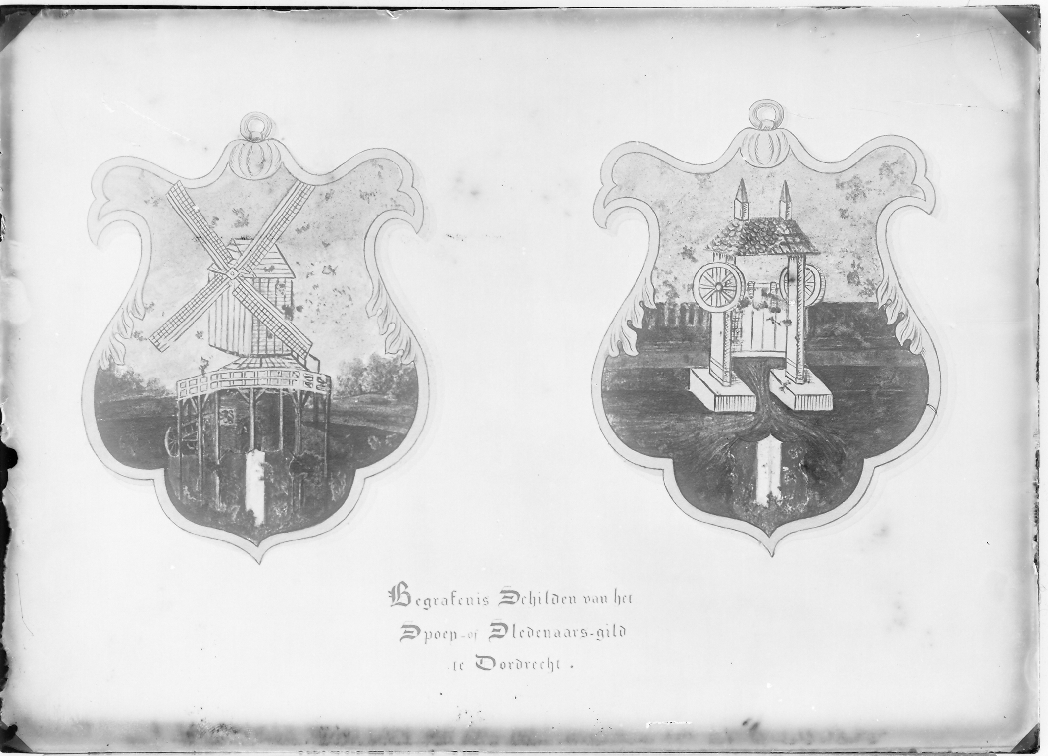 - Reproductie van een tekening in het museum Van Gijn van 'Begrafenis schilden van het Sproei- of Sledenaarsgild te Dordrecht