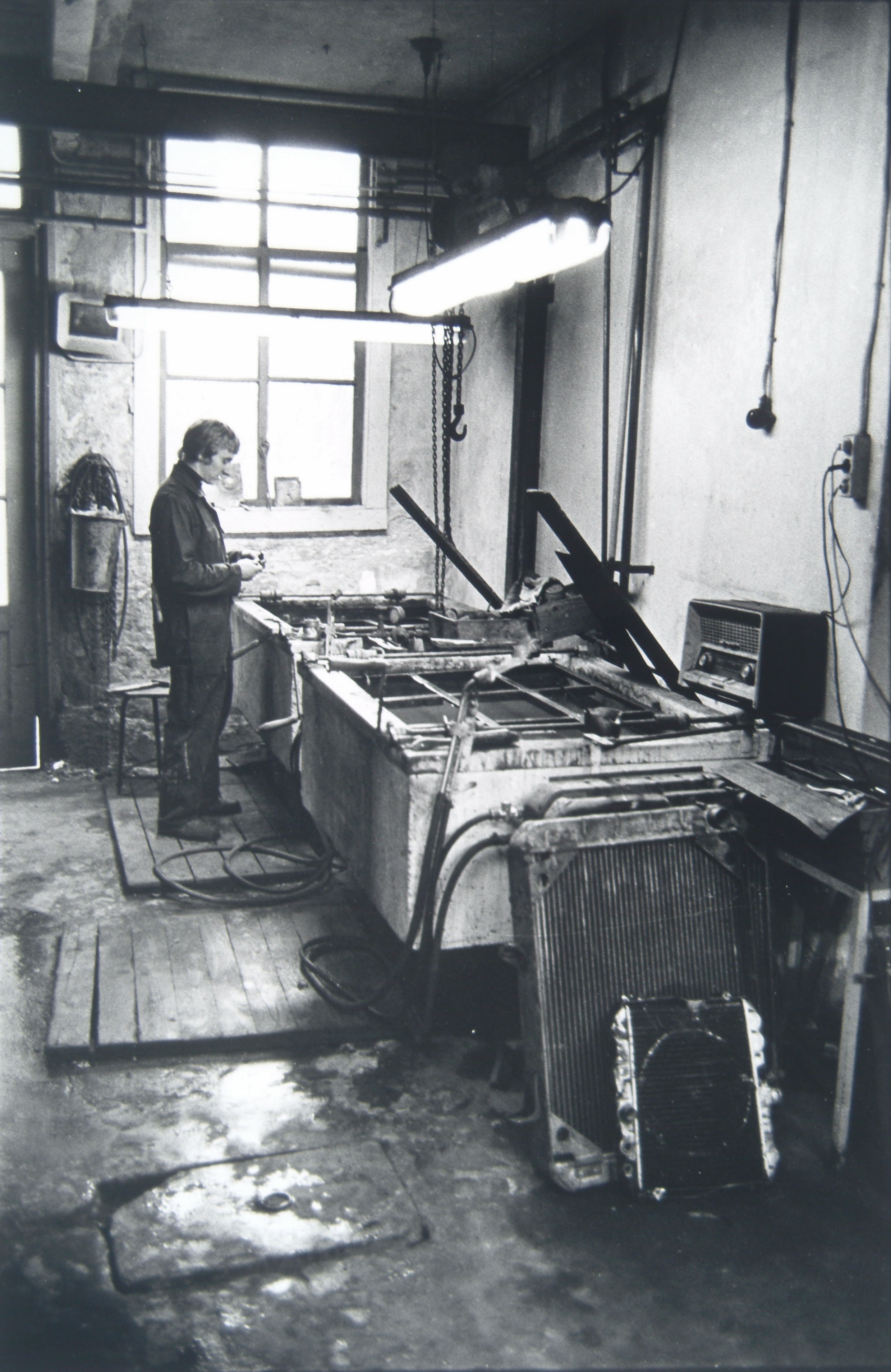 De man op de foto is Peter Pruimboom (achternaam weet ik niet zeker meer)De waterbakken waar hij bij staat gebruikte ze om gerepareerde radiatoren te testen op lekkages