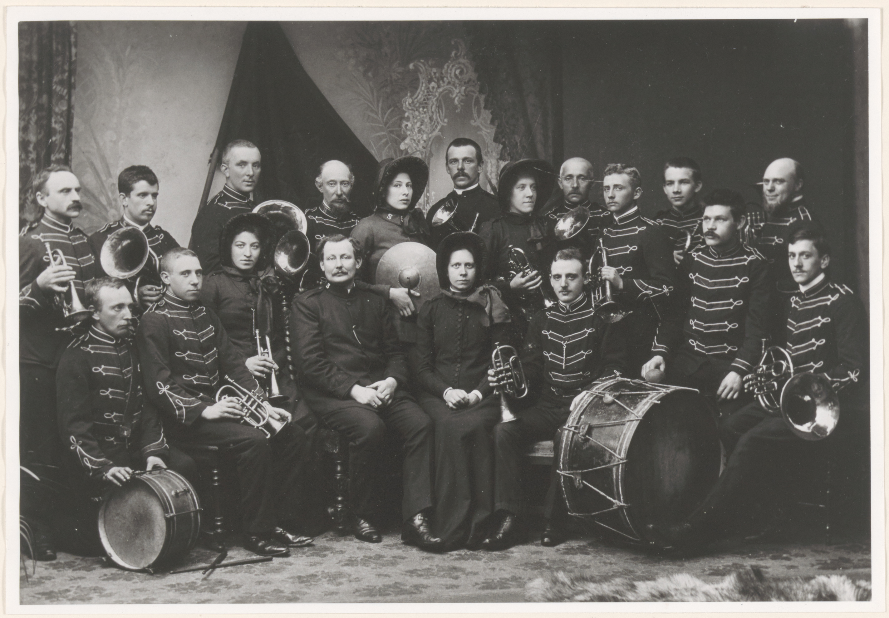 - groepsportretten muziekinstrumenten muziekkorpsen vaandels