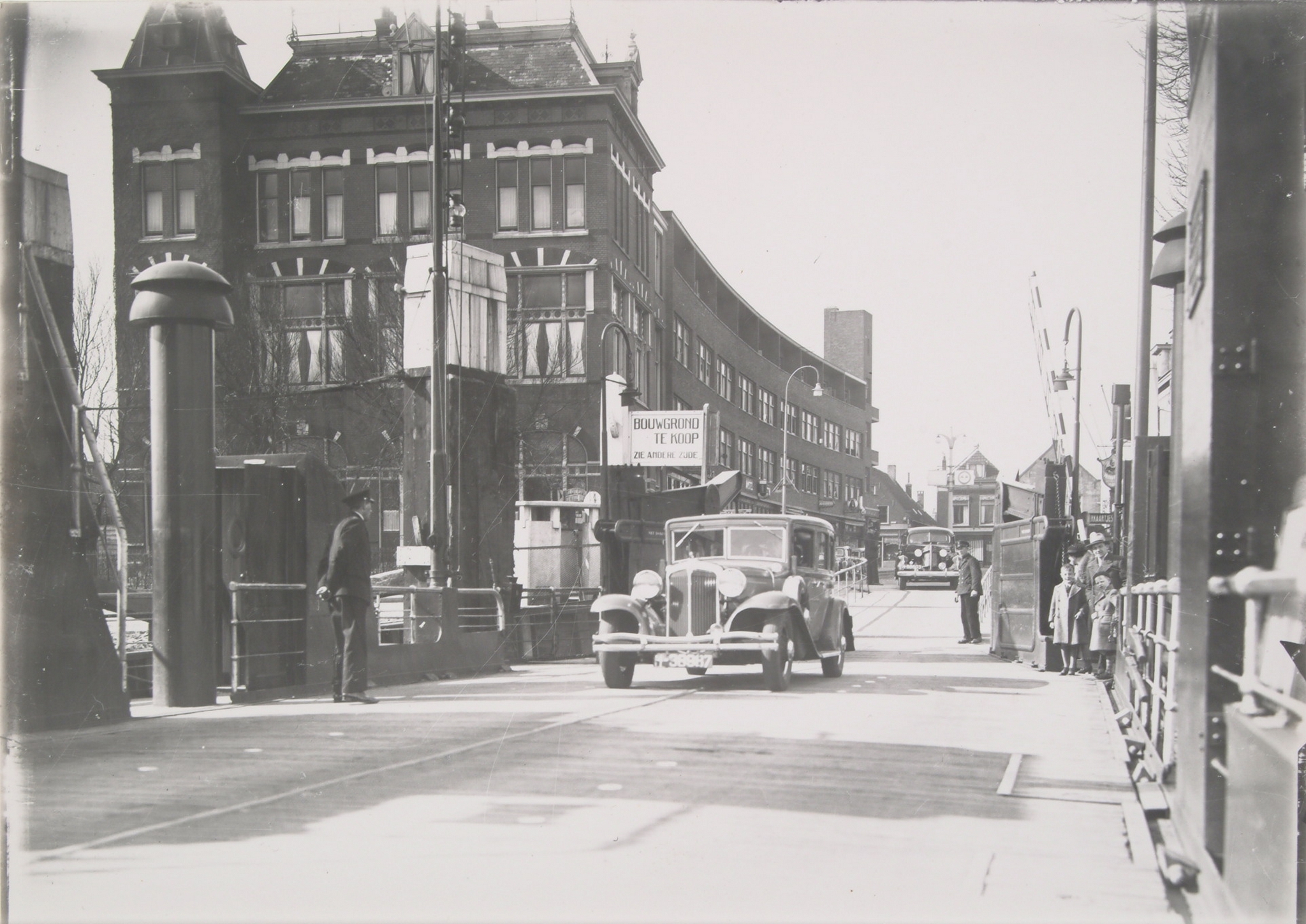 Een auto rijdt de pont naar Dordrecht op aan het Veerplein te Zwijndrecht; links het hotel Het Witte Paard