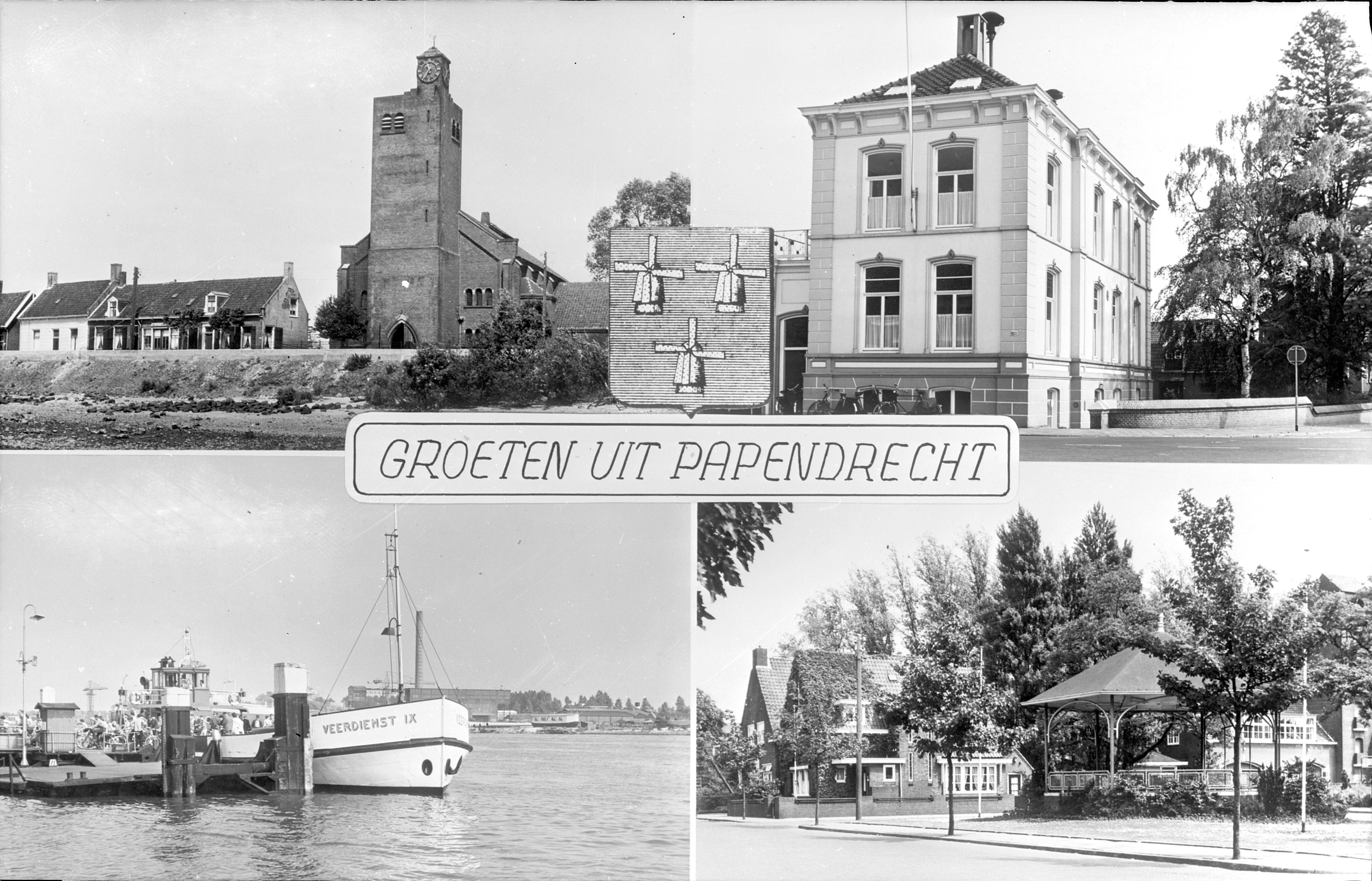 - Papendrecht met afbeeldingen van de Grote Kerk aan de Kerkbuurt, het gemeentehuis aan de zijde van het Bosch, de veerpont op de Beneden Merwede bij de aanlegplaats aan de Veerdam en de muziektempel aan de Eilandstraat.