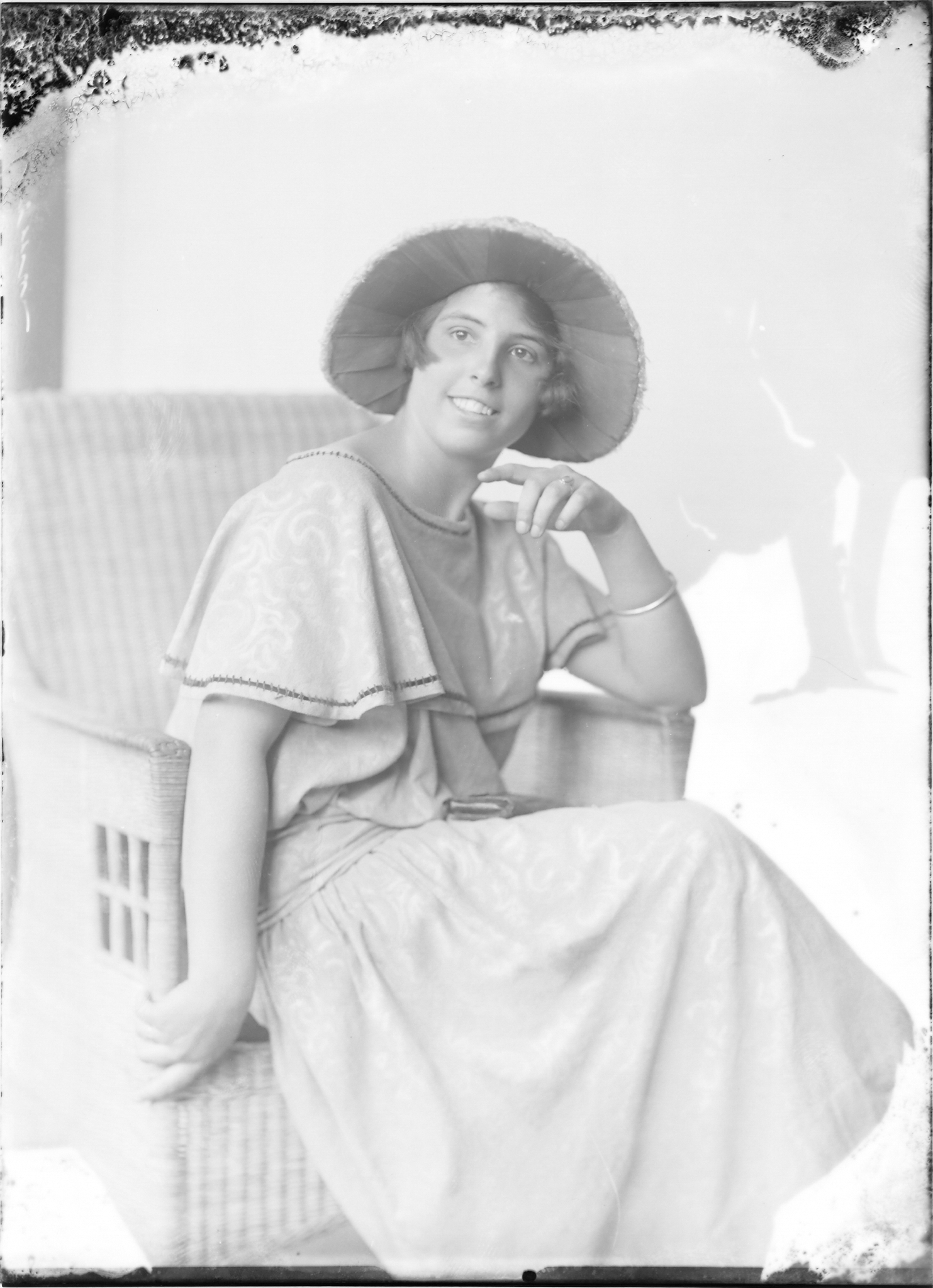 zittende vrouw met hoed ('voor etalage') ----- BEERMAN 06-08-1923 fotonummer 439 Mej. Looman [bron: www.dordtenazoeker.nl]