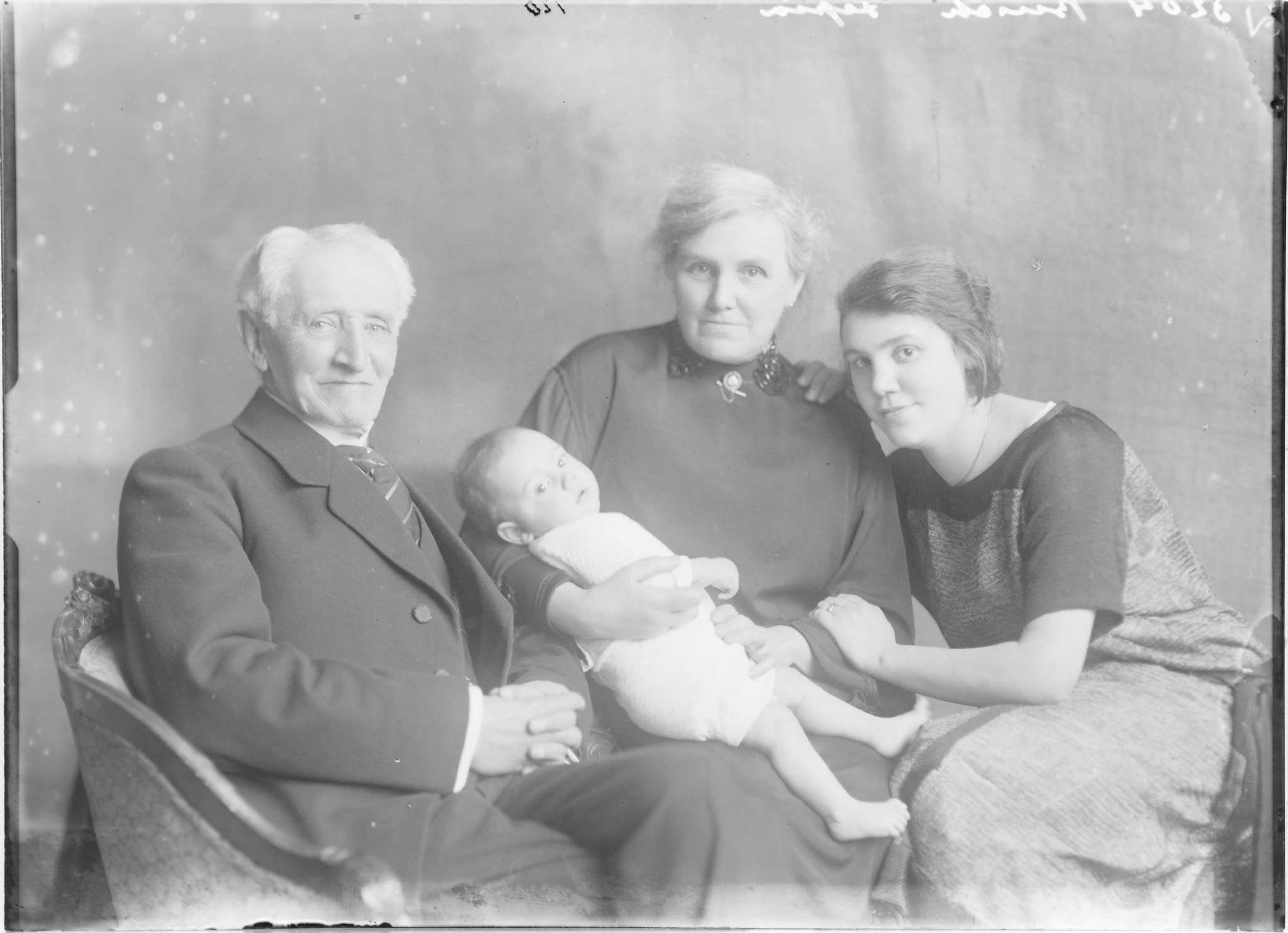 Vier generaties: overgrootvader P.J. Boudier, grootmoeder E.G.J. Masion-Boudier, moeder E.A. Busch-Masion en haar zoon J.H.M. Busch, 11 feb. 1925.