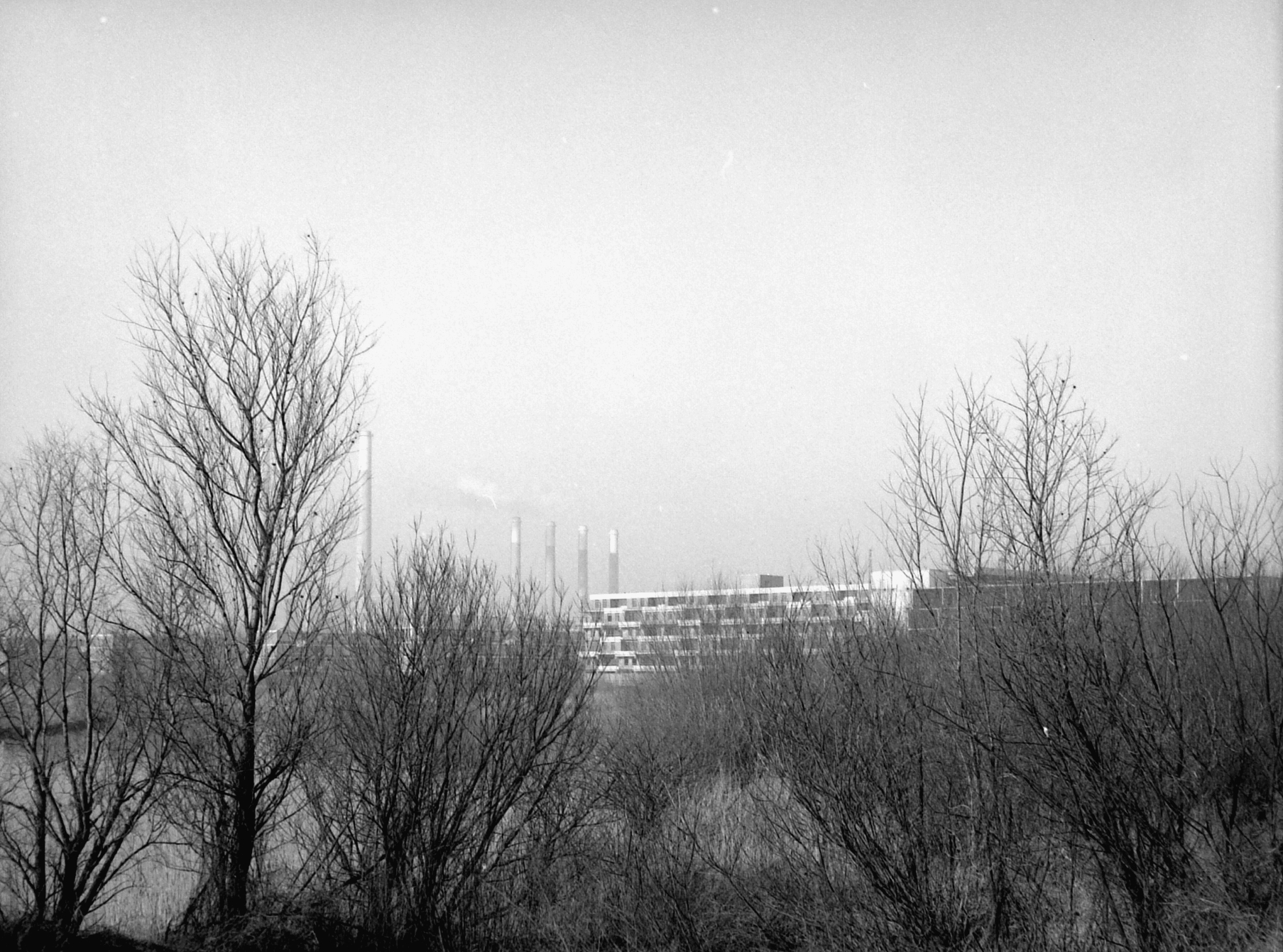 Op de achtergrond de schoorstenen van de Centrale Merwedehaven.