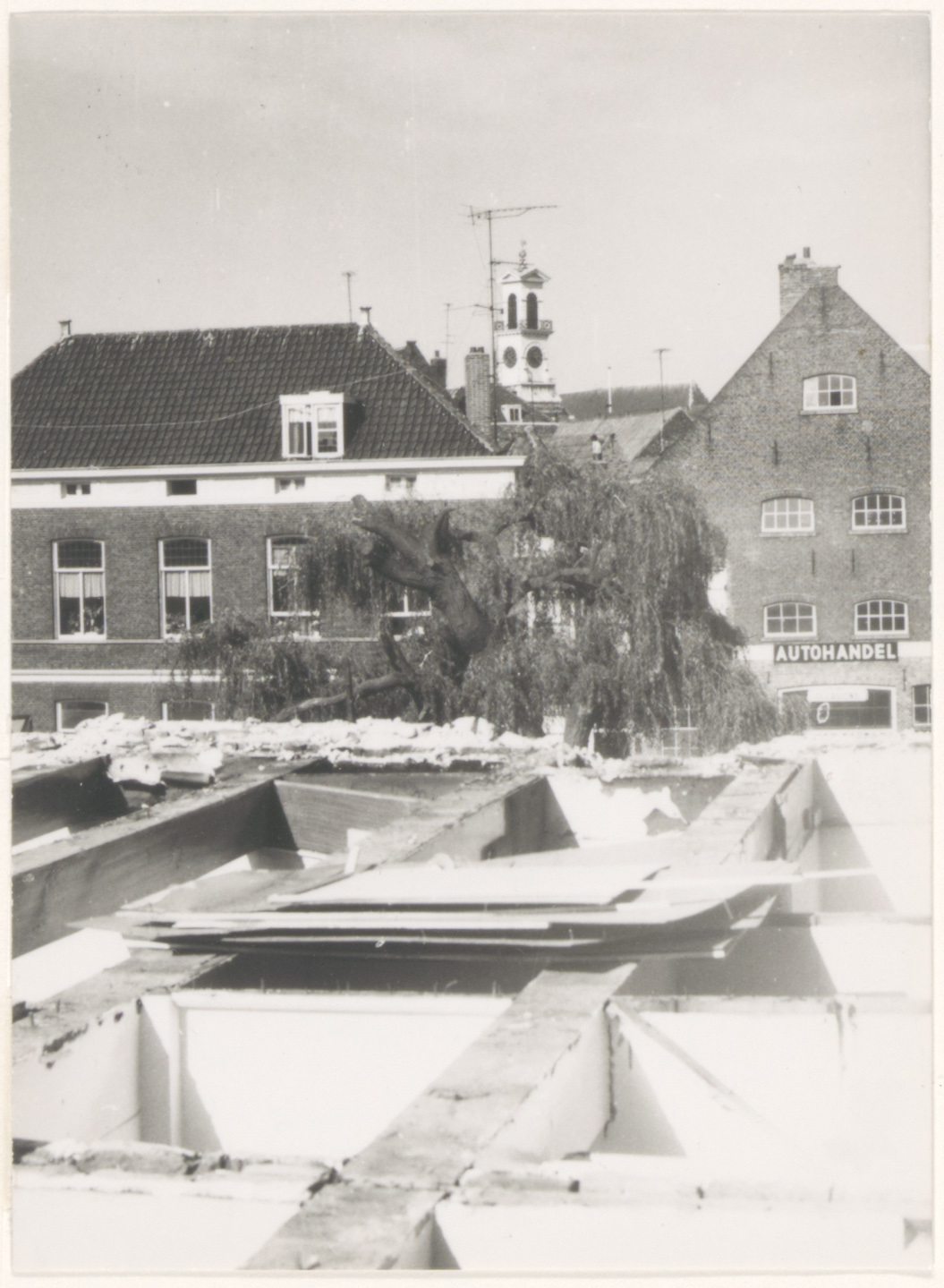De sloop van het huis 's Lands Werf, ook wel genoemd commandantshuis of kapiteinshuis, op de noordelijke hoek Cornelis de Wittstraat/Spuistraat. Het in 1856 gebouwde huis was oorspronkelijk de woning van de commandant van de pontonniers; in de 20e eeuw heeft het een sociëteit, poffertjeskraam en ten laatste dameskapper Lonny gehuisvest. De huizen staan op de Vest; op de achtergrond de toren van het stadhuis.