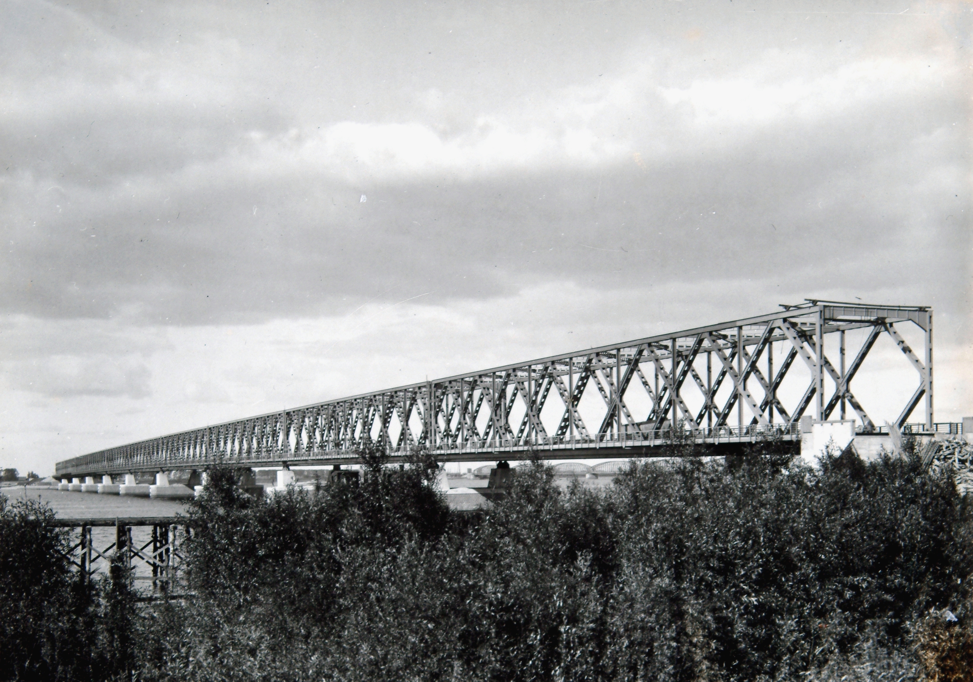 - De verkeersbrug over het Hollandsch Diep, gezien vanaf de Brabantse naar de Dordtse kant. Onder de brug door is de spoorbrug zichtbaar.