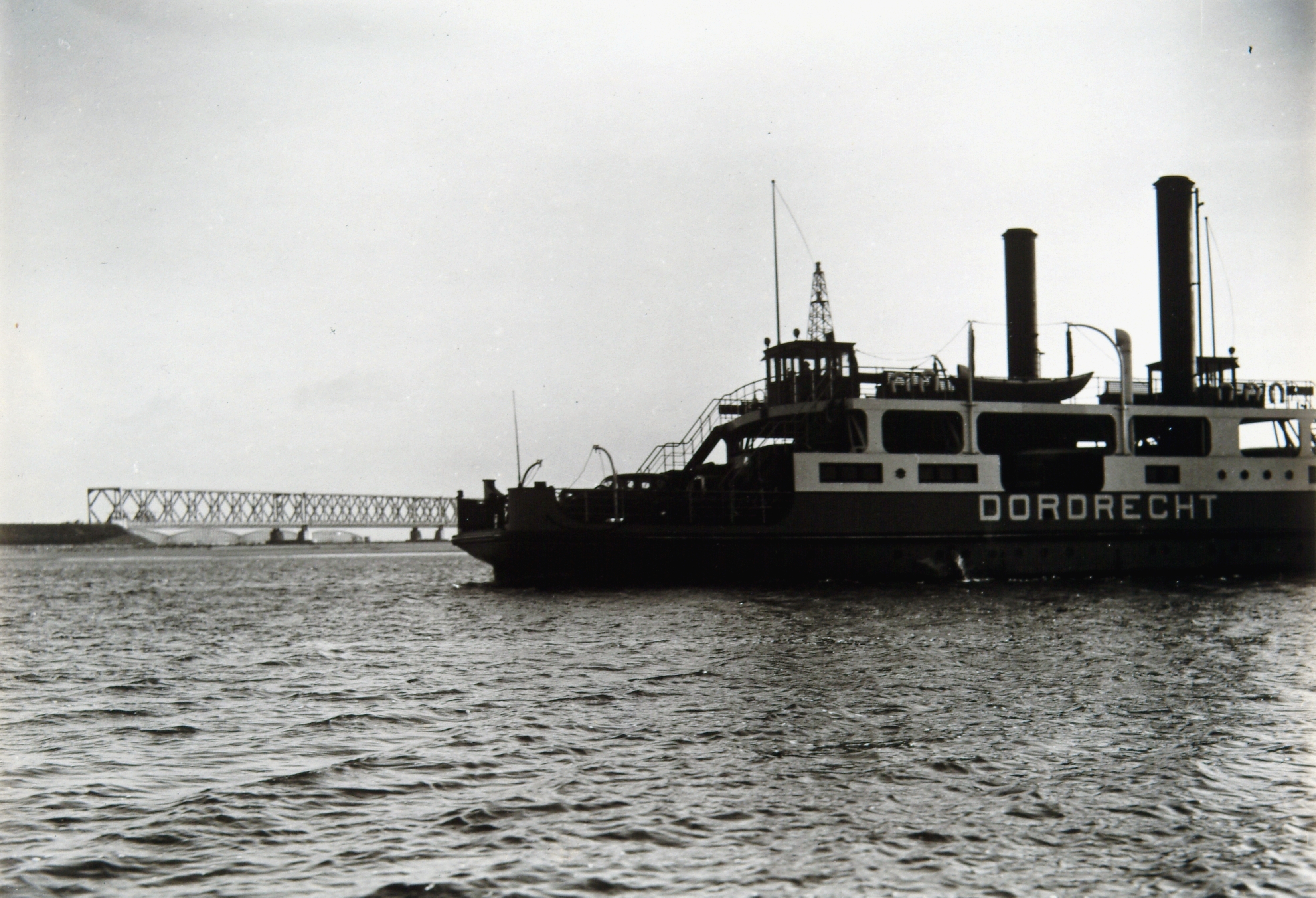 - Veerboot "Dordrecht" varend tussen Willemsdorp en Moerdijk maakt een van zijn laatste tochten nu de verkeersbrug (achtergrond) over het Hollandsch Diep gereed is.