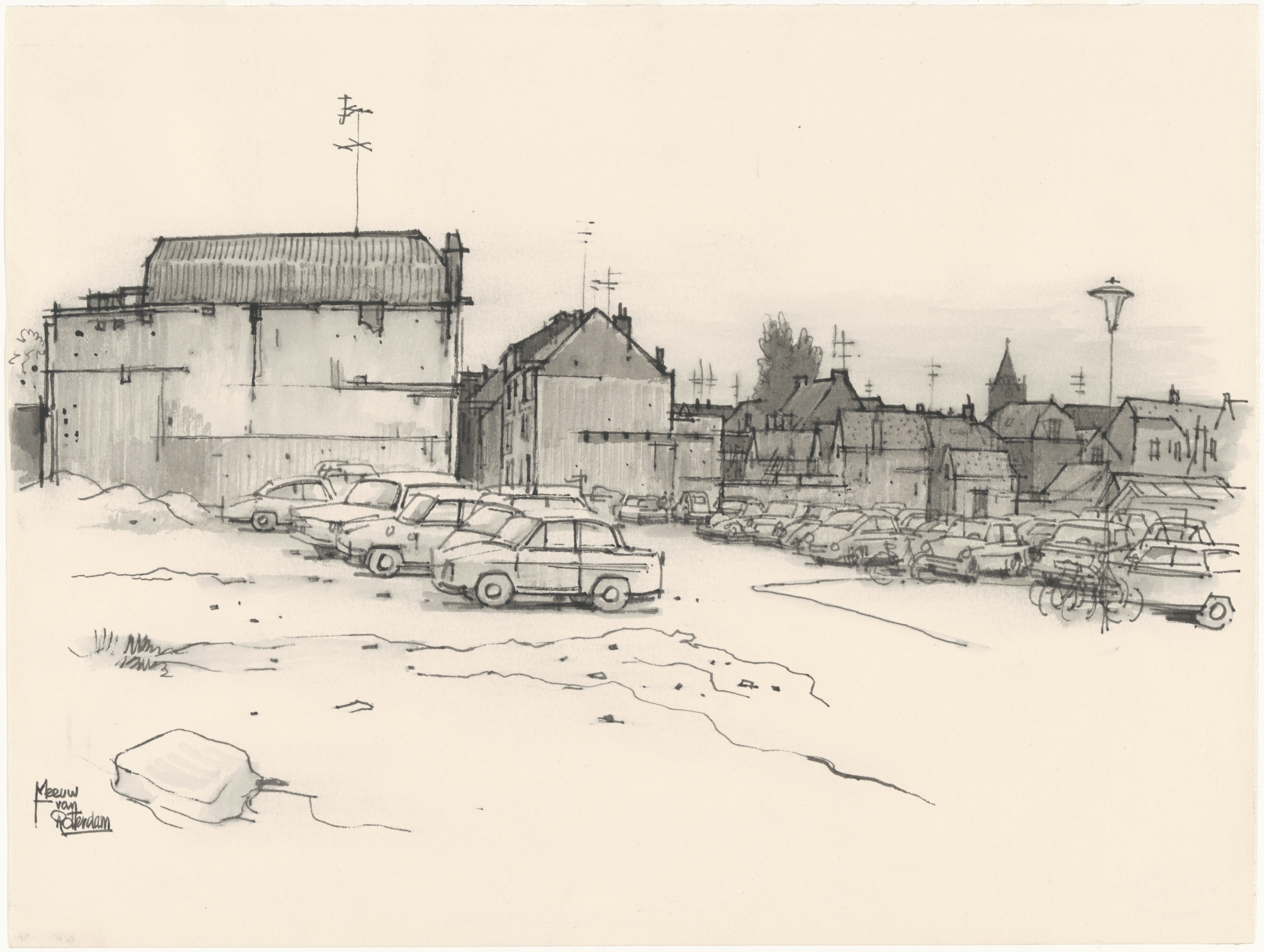 Het Statenplein in aanbouw, op de achtergrond de toren van de Rem. kerk.
