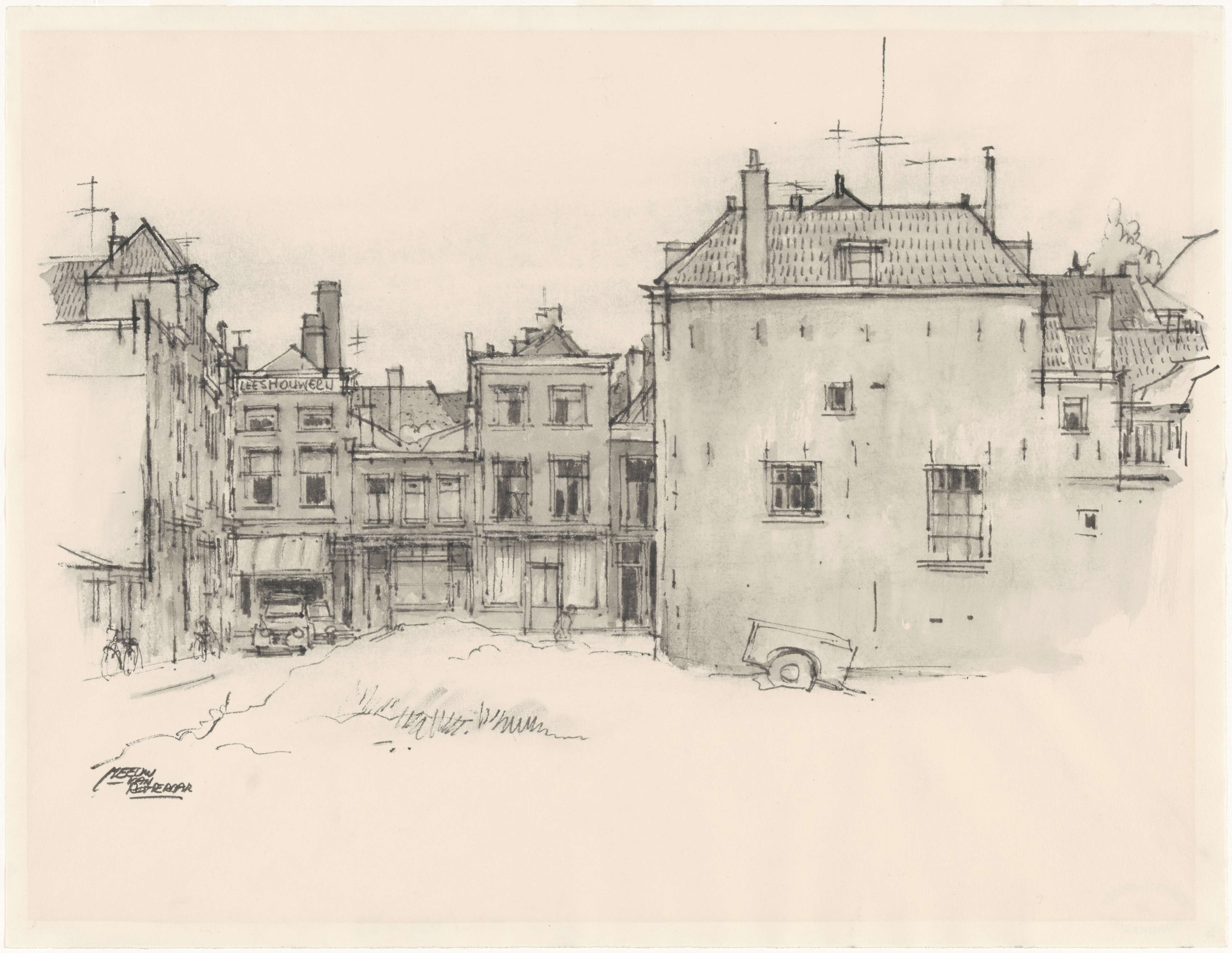 Gezicht op de huizen aan de Aardappelmarkt vanaf de Varkenmarkt.
