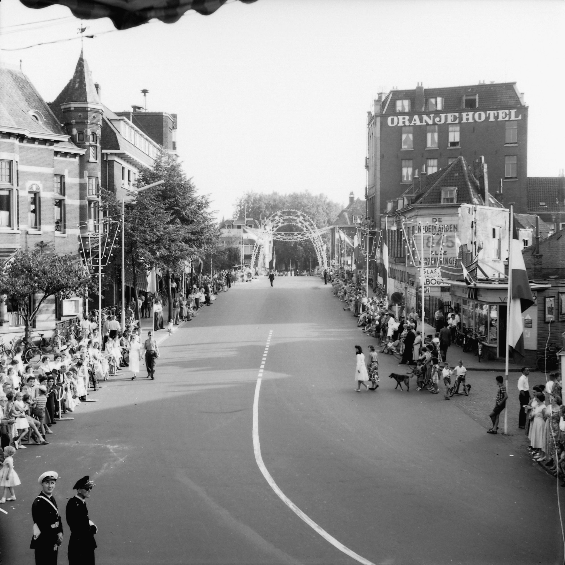 - Johan de Wittstraat. Mensen wachtend op Koningin Juliana vanwege de opening van de Zeehaven