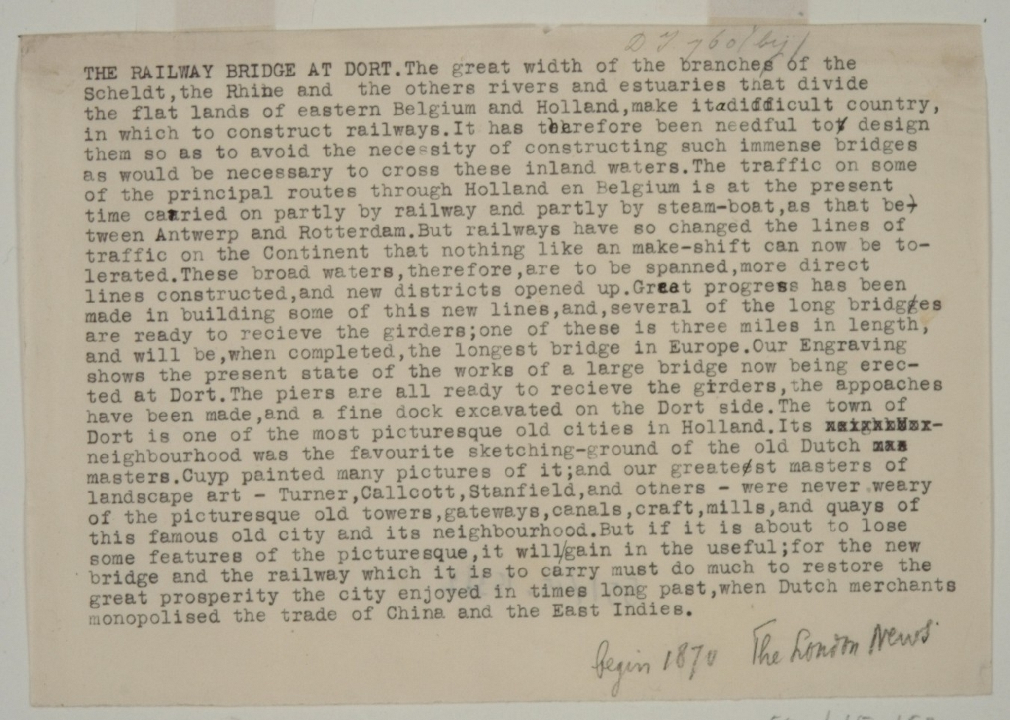 - Overgetypt artikel uit The London News van begin 1870 over de aanleg van de spoorbrug tussen Dordrecht en Zwijndrecht.