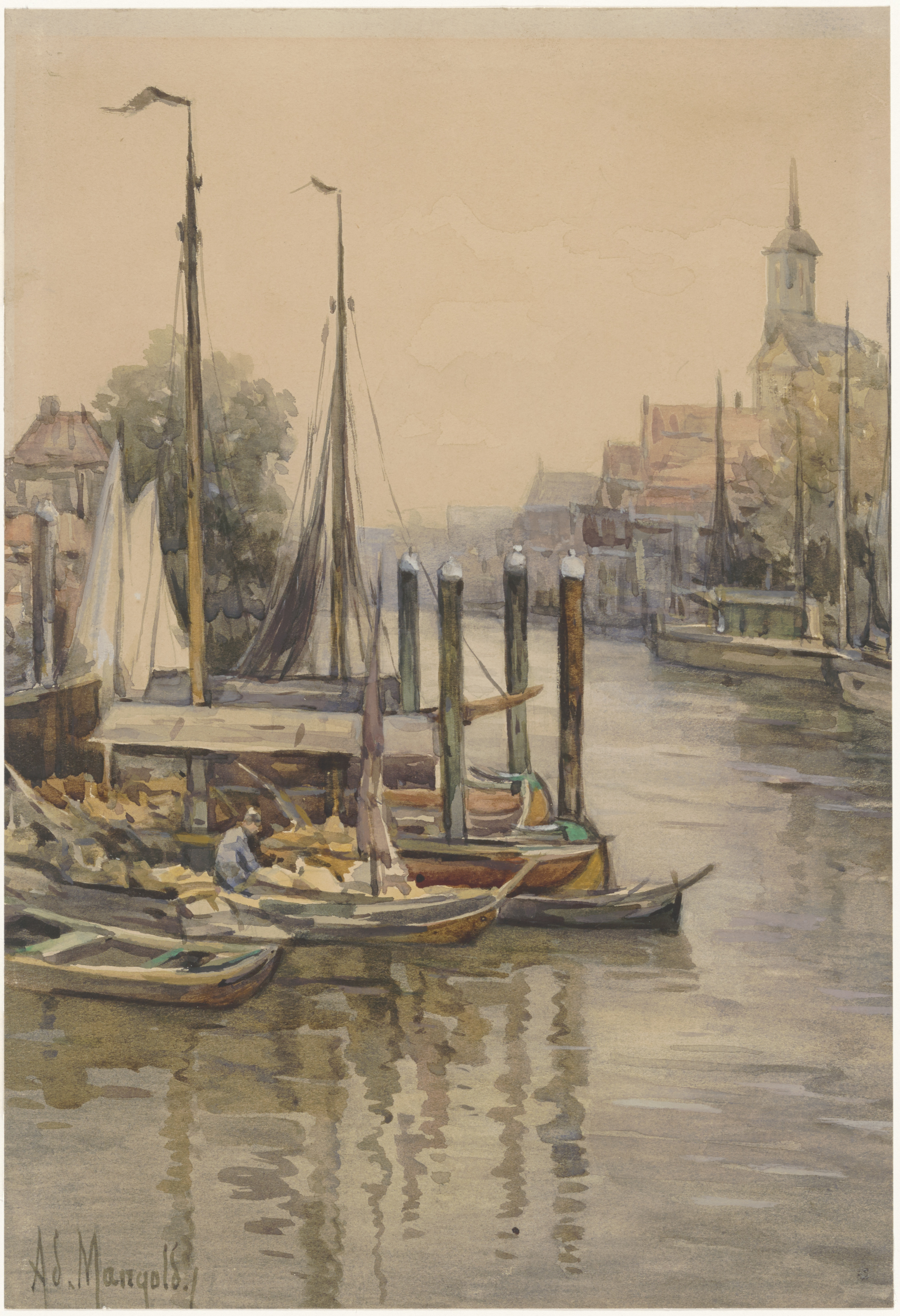 - Gezicht op de Voorstraatshaven (Wijnhaven) tussen de Boombrug en de Nieuwbrug, vanaf de Taankade in zuidwestelijke richting; geheel rechts de Bonifatiuskerk aan de Wijnstraat.