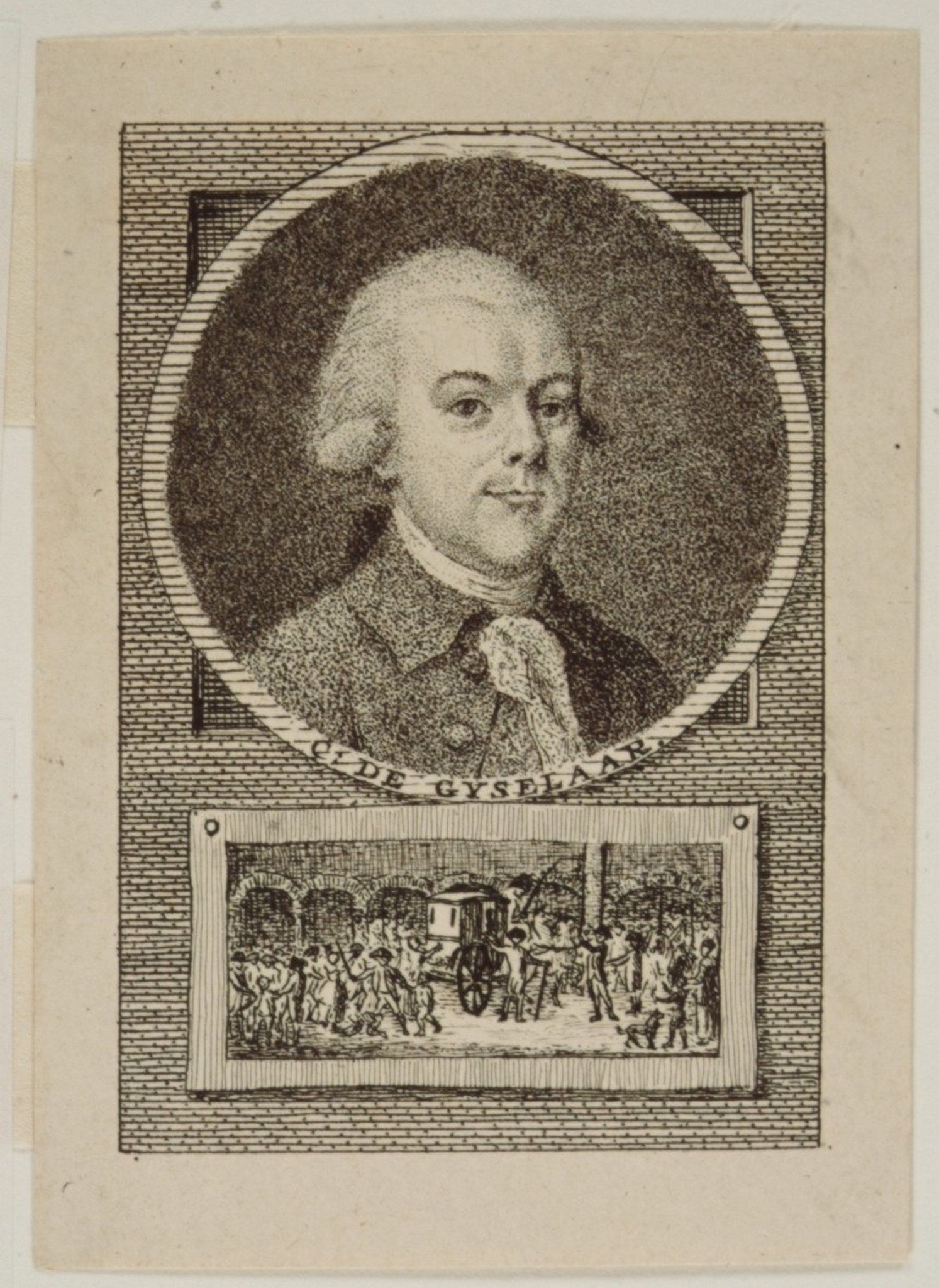 - Aanslag op Dordtse Gedeputeerden in Den Haag, 17 maart 1786; met portret van C. de Gijzelaar, Pensionaris van de stad Dordrecht.
