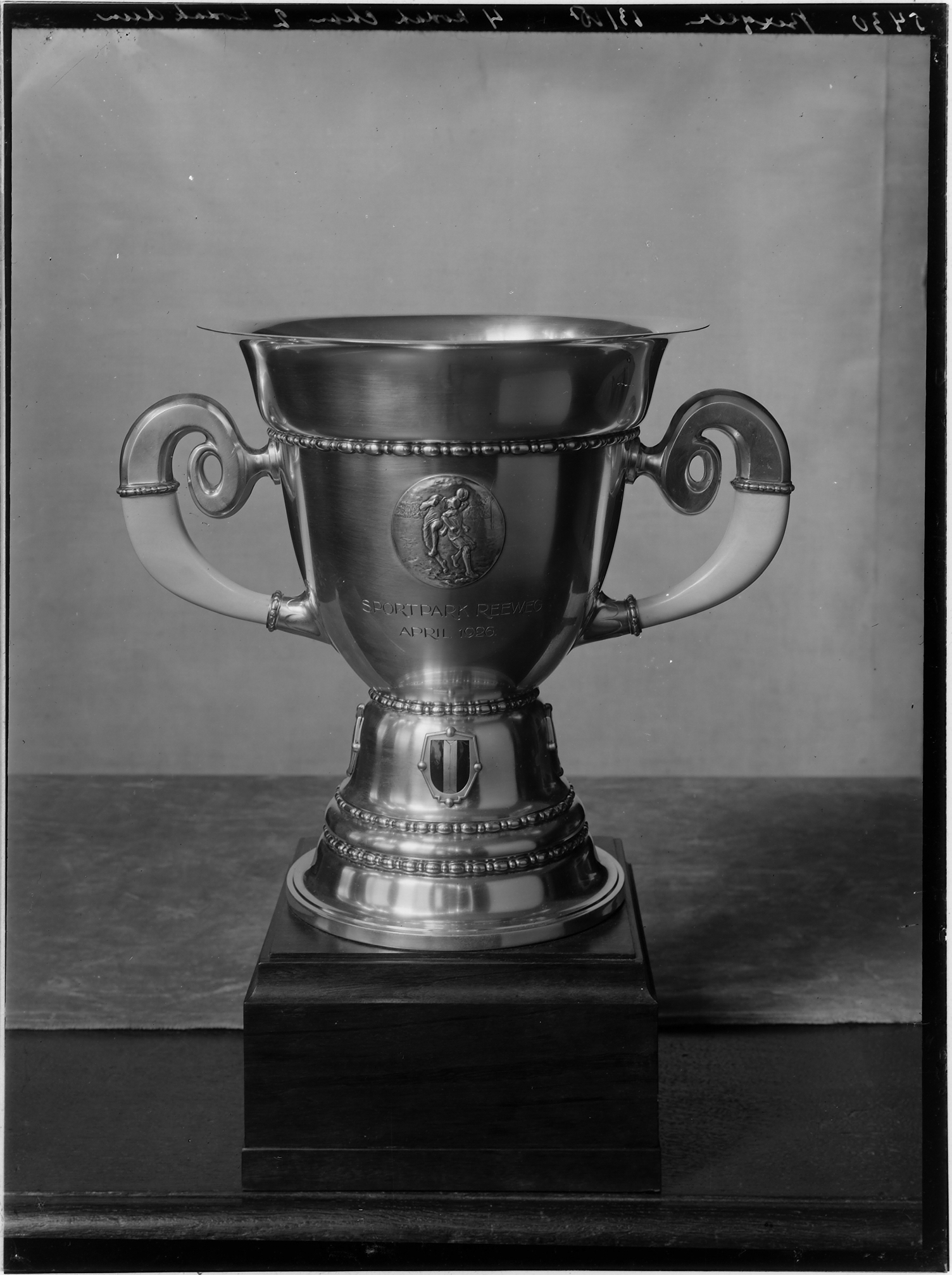 Voetbalbeker met wapen van Dordrecht en tekst 'Sportpark Reeweg april 1926'