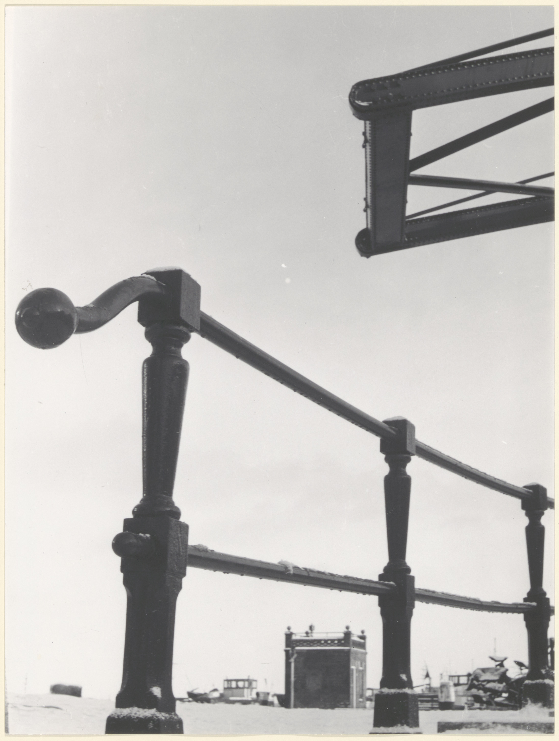 - Het uiteinde van één van de leuningen van de Damiatebrug aan de kant van de Wolwevershaven; op de achtergrond het Damiatebolwerk.