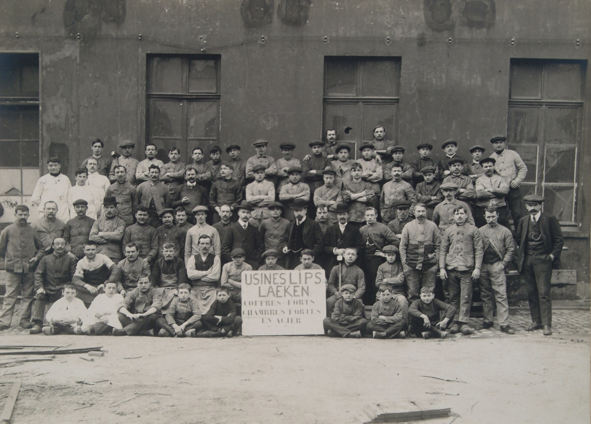 - Groepsportret van het personeel van en voor de Lips fabriek aan de Roodhuisplaats te Laeken bij Brussel