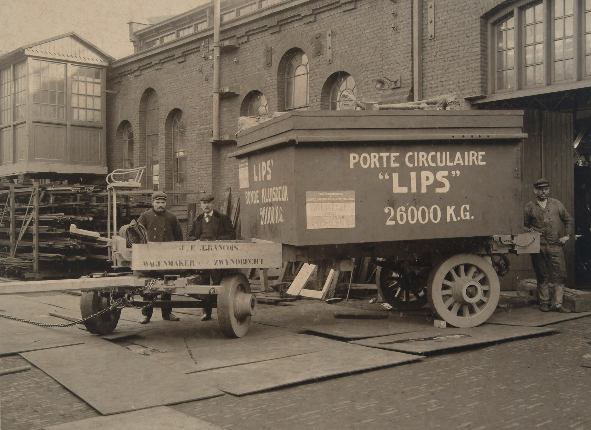 In het Dordr Nieuwsblad van 22 maart 1910 staat een arikel van het bezoek van Z.K.H. Prins Hendrik aan deze gemeente de brandkastenfabriek der firma J.Lips Bzn. met een visite vereerde, werd de aandacht van Z.K. Hoogheid, in het bijzonder gevestigd op een ronde kluiddeur, de eerste en tot nu toe de eenige in Europa. Dit deurtje met kozijntje heeft het niet onaardige gewicht van 25000 kilogram en is bestemd om te worden tentoongesteld op de Brusselsche Expositie, die in het laatst van April geopend wordt.etc.... De heer J.E.Francoys (zie vermelding op de voorzijde van de wagen), wagenmaker te Zwijndrecht, heeft voor de firma W. Van Twist, alhier, een vrachtwagen gemaakt, sterk 15000K.G. Dit voertuig werd nu benut voor het verdere transport der kluis.