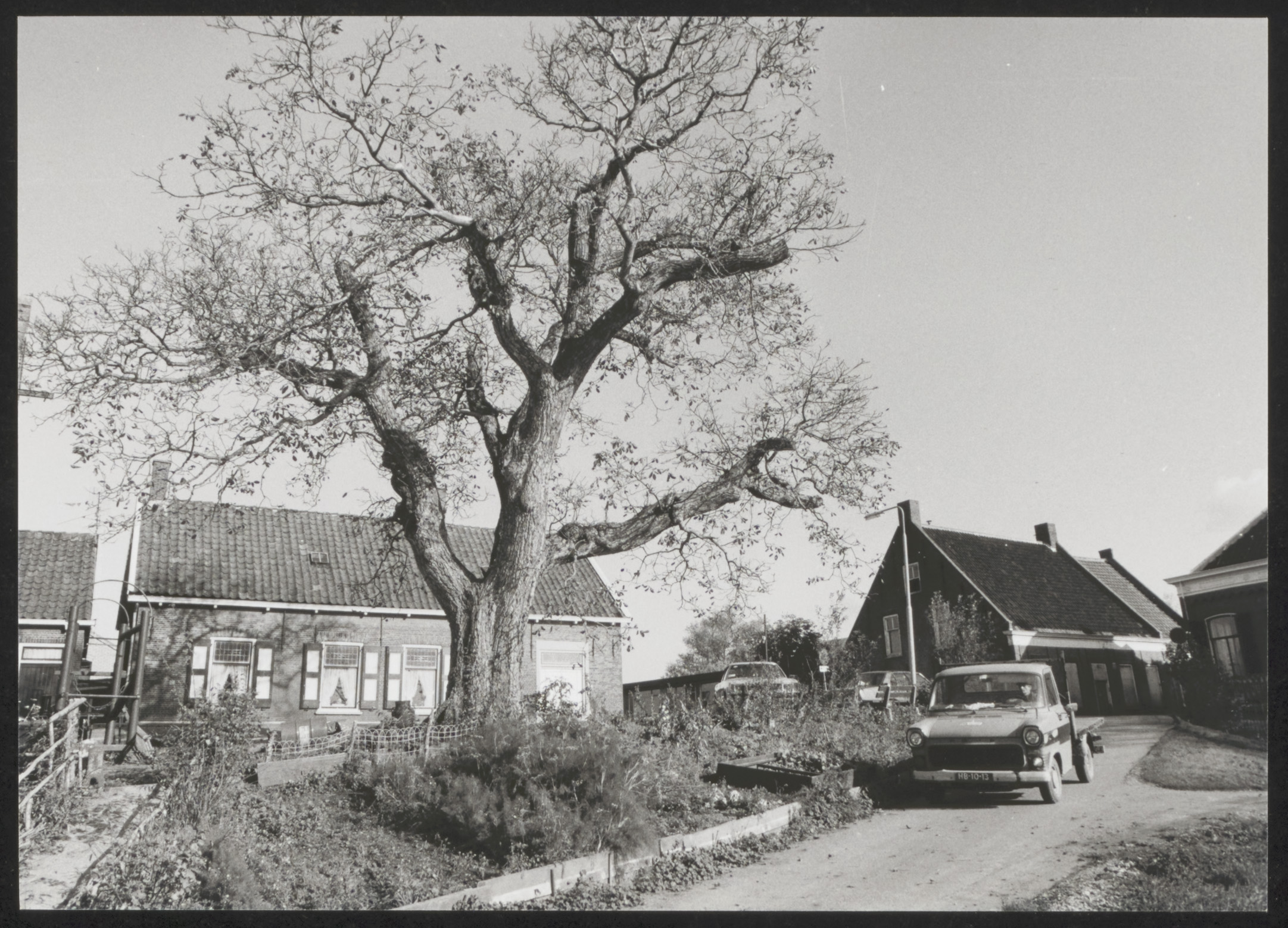 Heinenoord, Dorpsstraat. Afrit naar boerderij 'Midden-Leeuwenstein' met links het pand van de "hoefsmid met rijksdiploma's, de grote notenboom en rechts de rentenierswoning van De Bruijn.