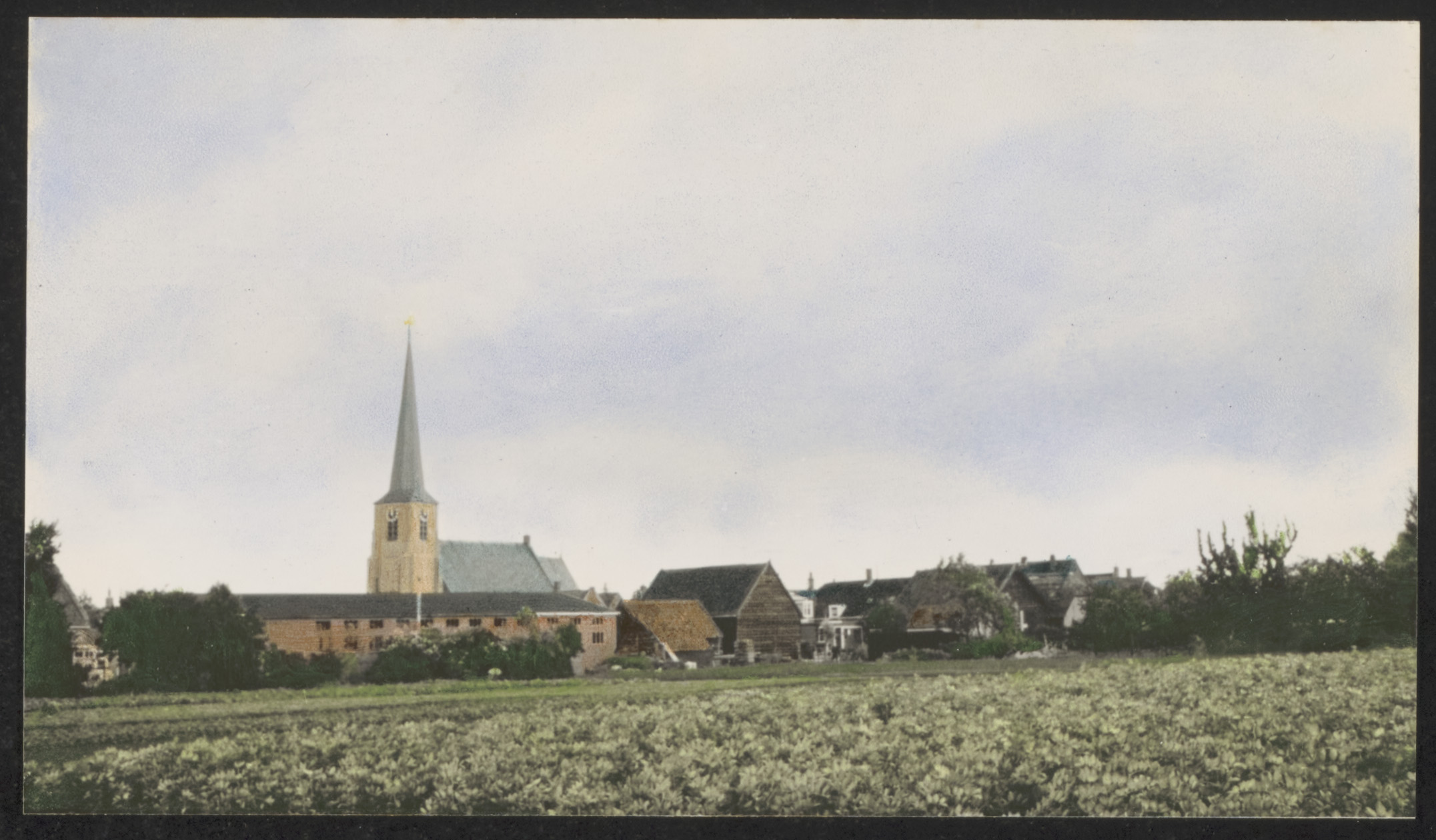 Gezicht op Mijnsheerenland vanaf de Molenweg (ter hoogte van nr.2). Het grote gebouw voor de kerk is de voormalige garage van Reedijk. De houten schuur was (deels) van Jan Roos, die ook het land op de voorgrond als tuinder gebruikte.