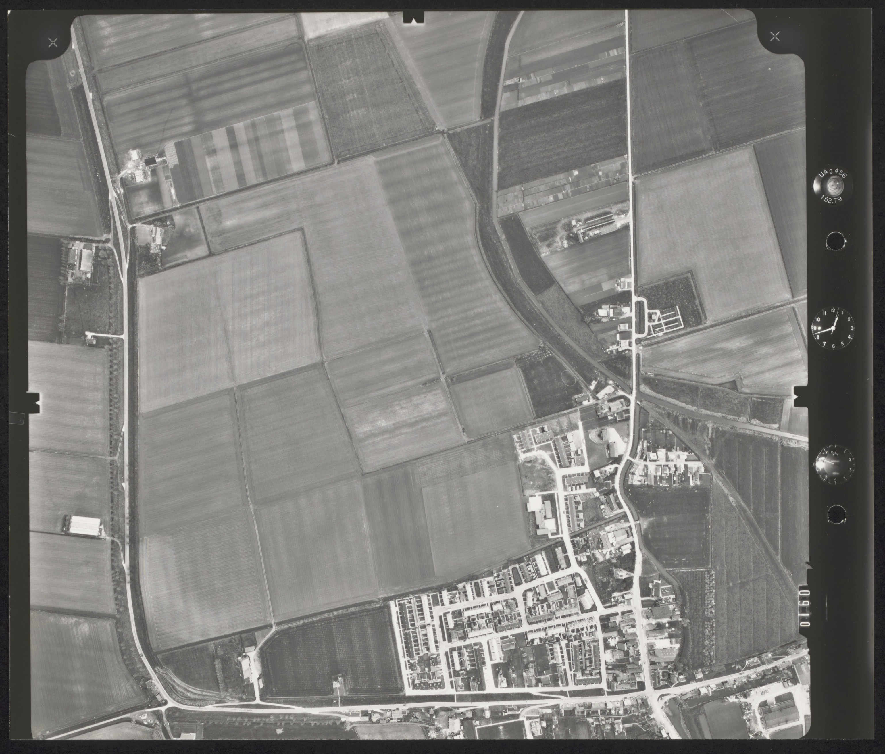 Piershil gezien in oostelijke richting met links de Oudendijk en onder de Molendijk 1973
