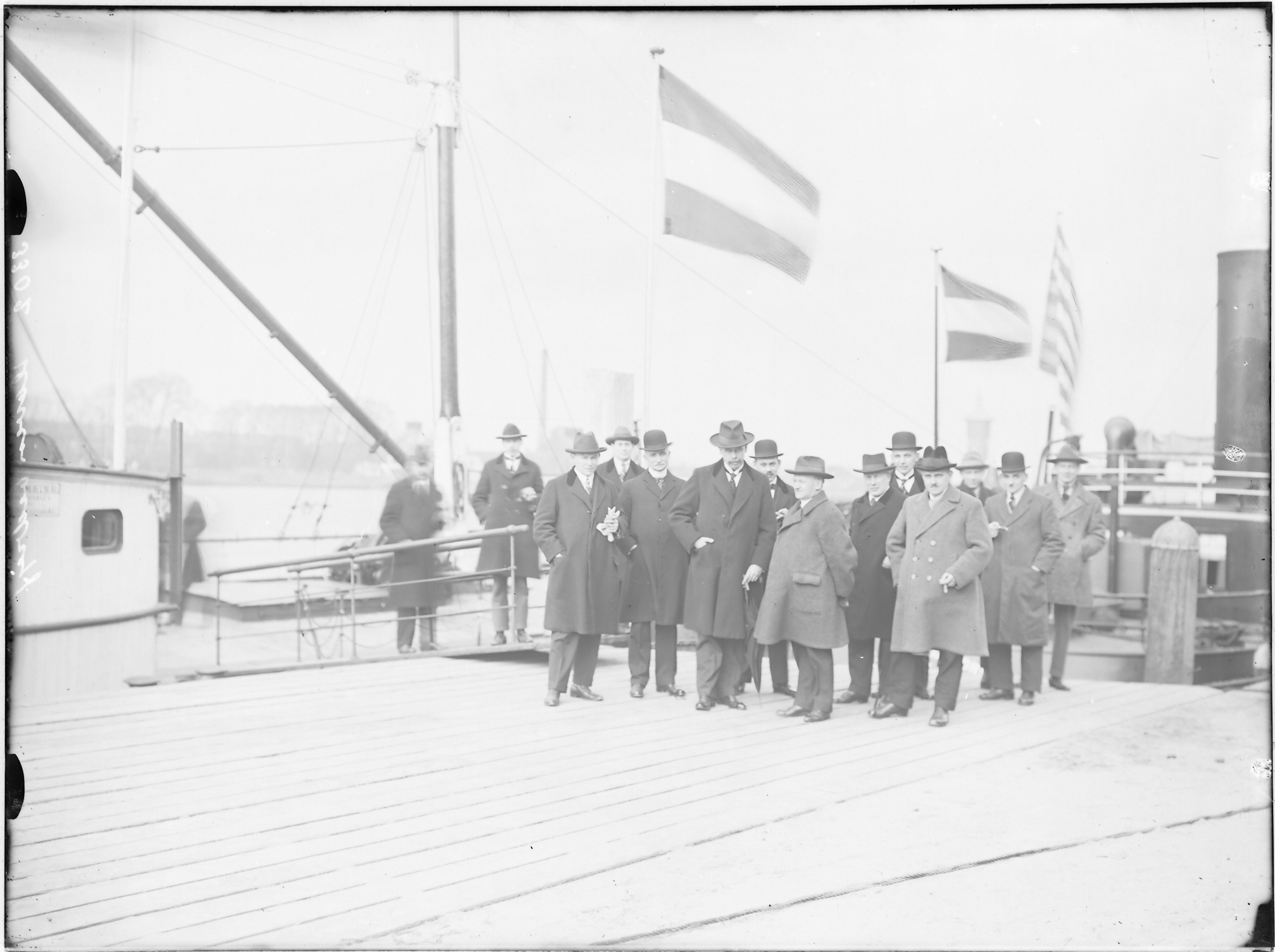Gezelschap heren, mogelijk van de Havendienst, op de Hooikade bij de ontvangst van 3 schepen