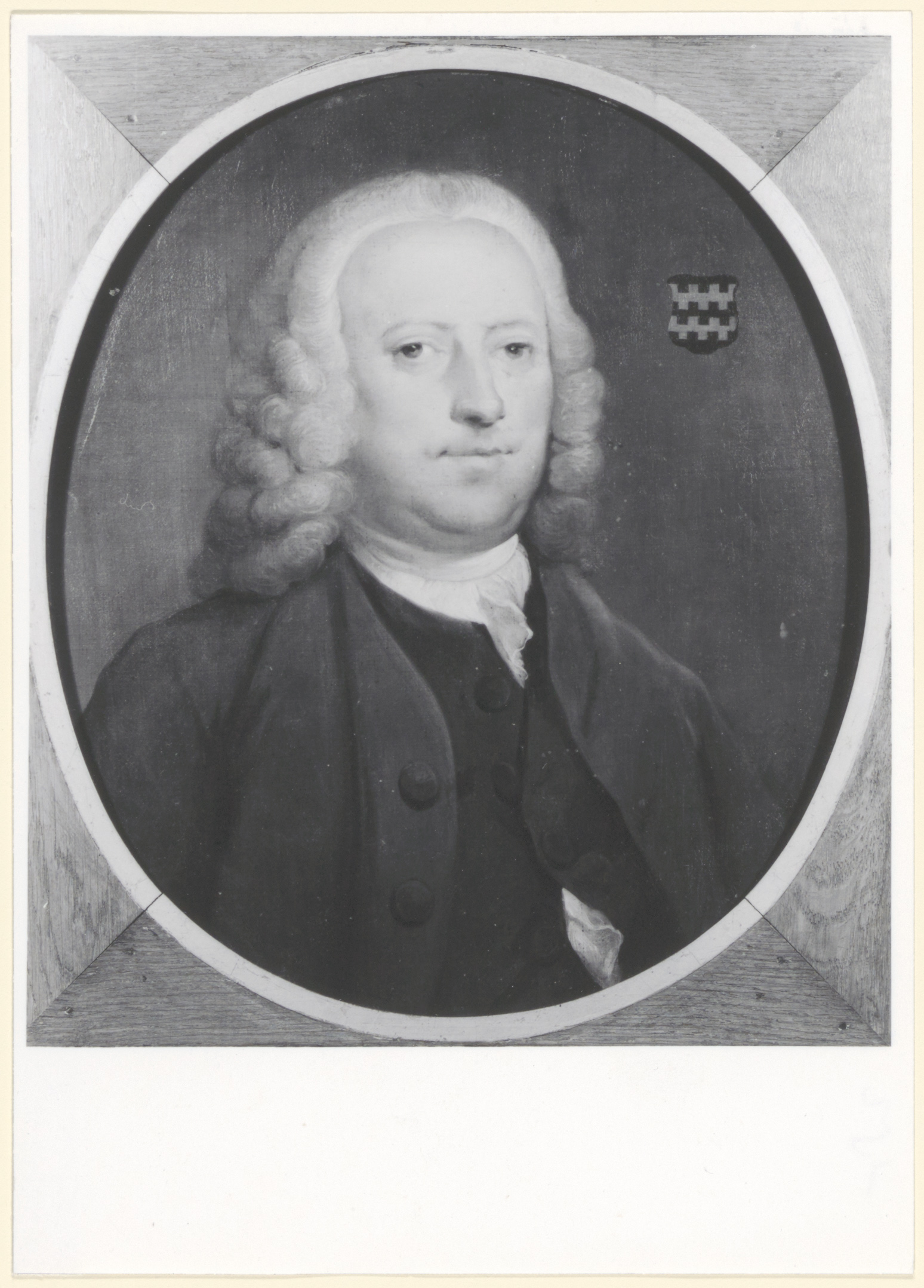 - Mr. Hendrik des H.R.R. baron van Slingelandt (1702-1759, schepen en burg. van Den Haag), geschilderd van voren met witte pruik; wapen rechtsboven.