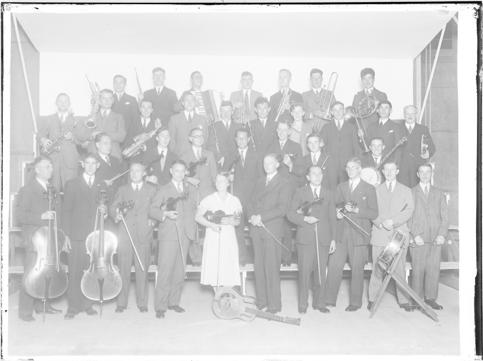 Groepsportret van (gelegenheids)orkest de Flierefluiters t.g.v. de revue bij het …