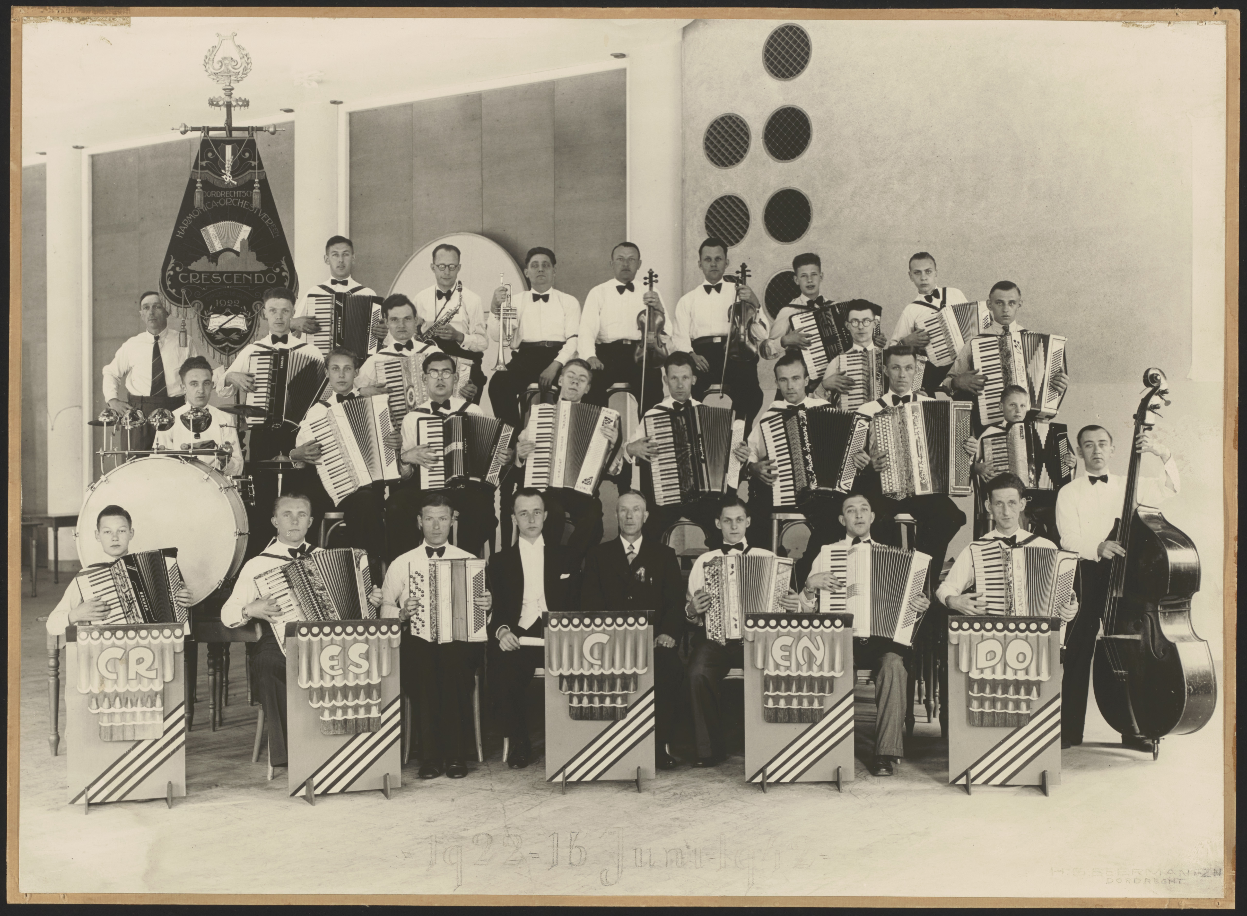 - Dordrechtsche Harmonica-Orchestvereeniging Crescendo met het vaandel in de kleine zaal van schouwburg Kunstmin tijdens hun 20-jarig jubileum.