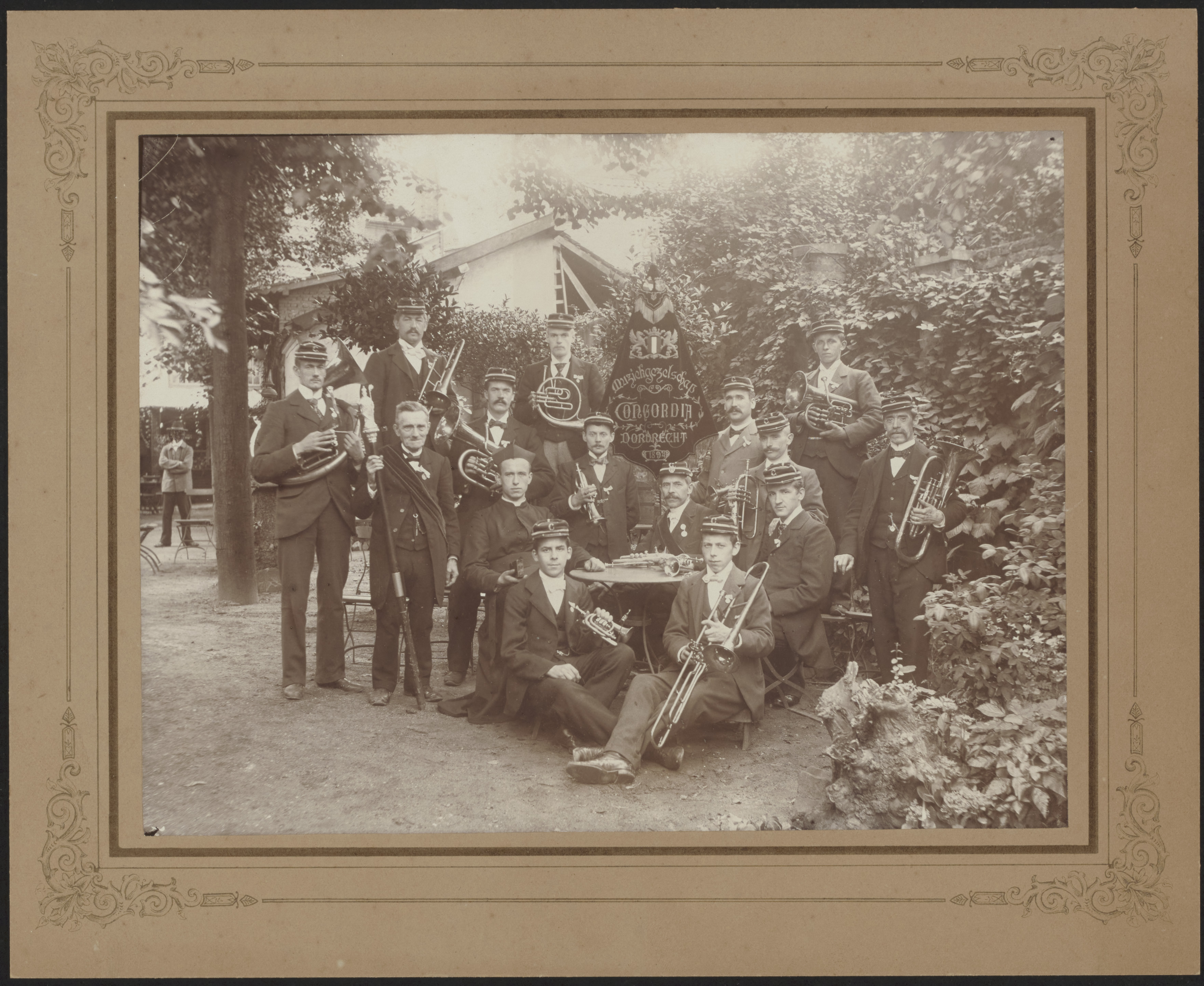 - Groepsportret en vaandel van Muziekgezelschap Concordia. Op de achterzijde is met kruisjes de plaats van een aantal met name personen aangegeven: A. Hurkmans, (bibliothecaris), M.G. Schenau, B.J. Grobben (secretaris), A.J. Rutten (penningmeester), H. Smits (tuba, rechts op de foto), Jansen, G. Smits (trombone) en L. Dresselaars (president-directeur).
