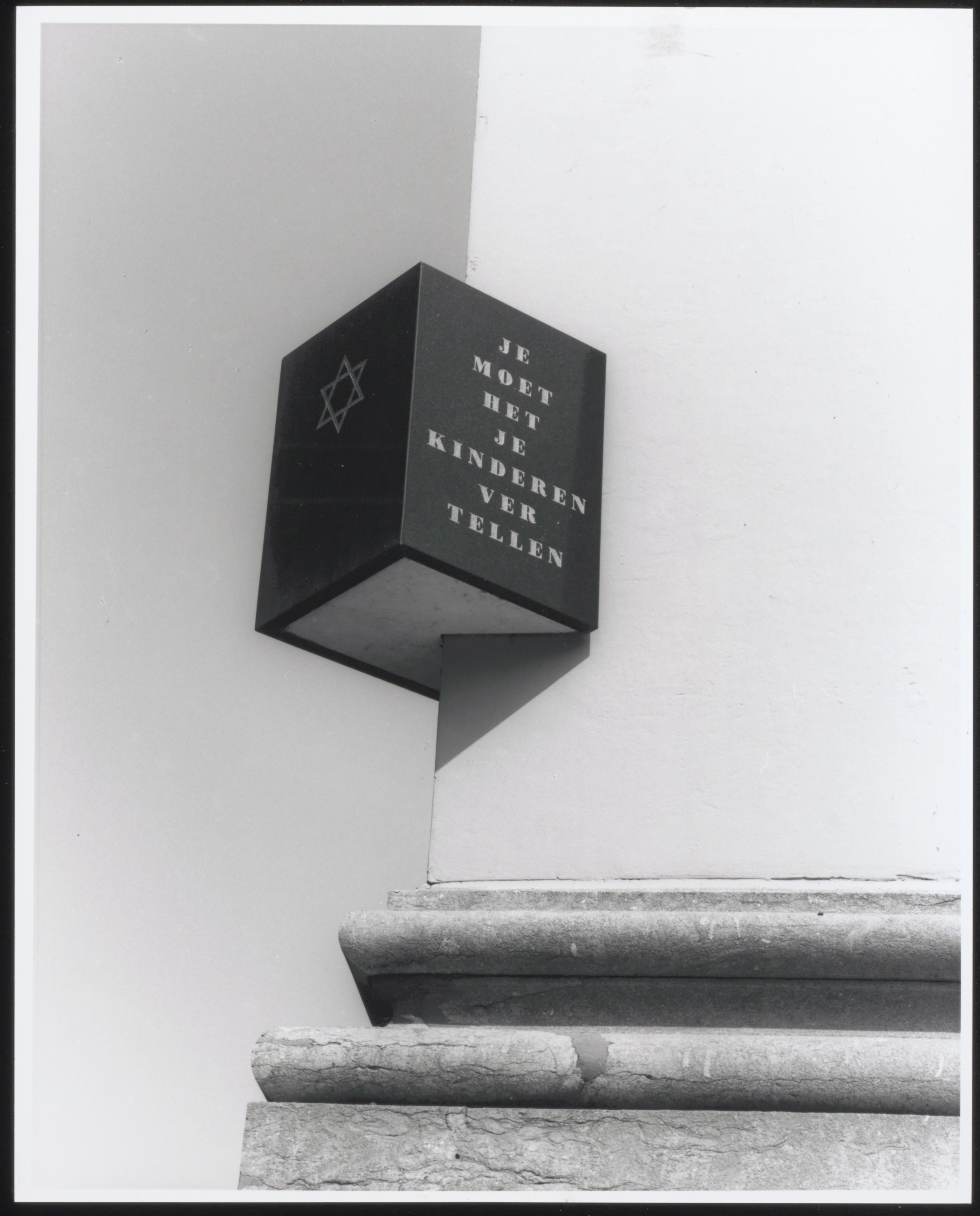 - Gedenkteken bevestigd aan de gevel van het Stadhuis op de hoek van het Stadhuisplein en de Groenmarkt.