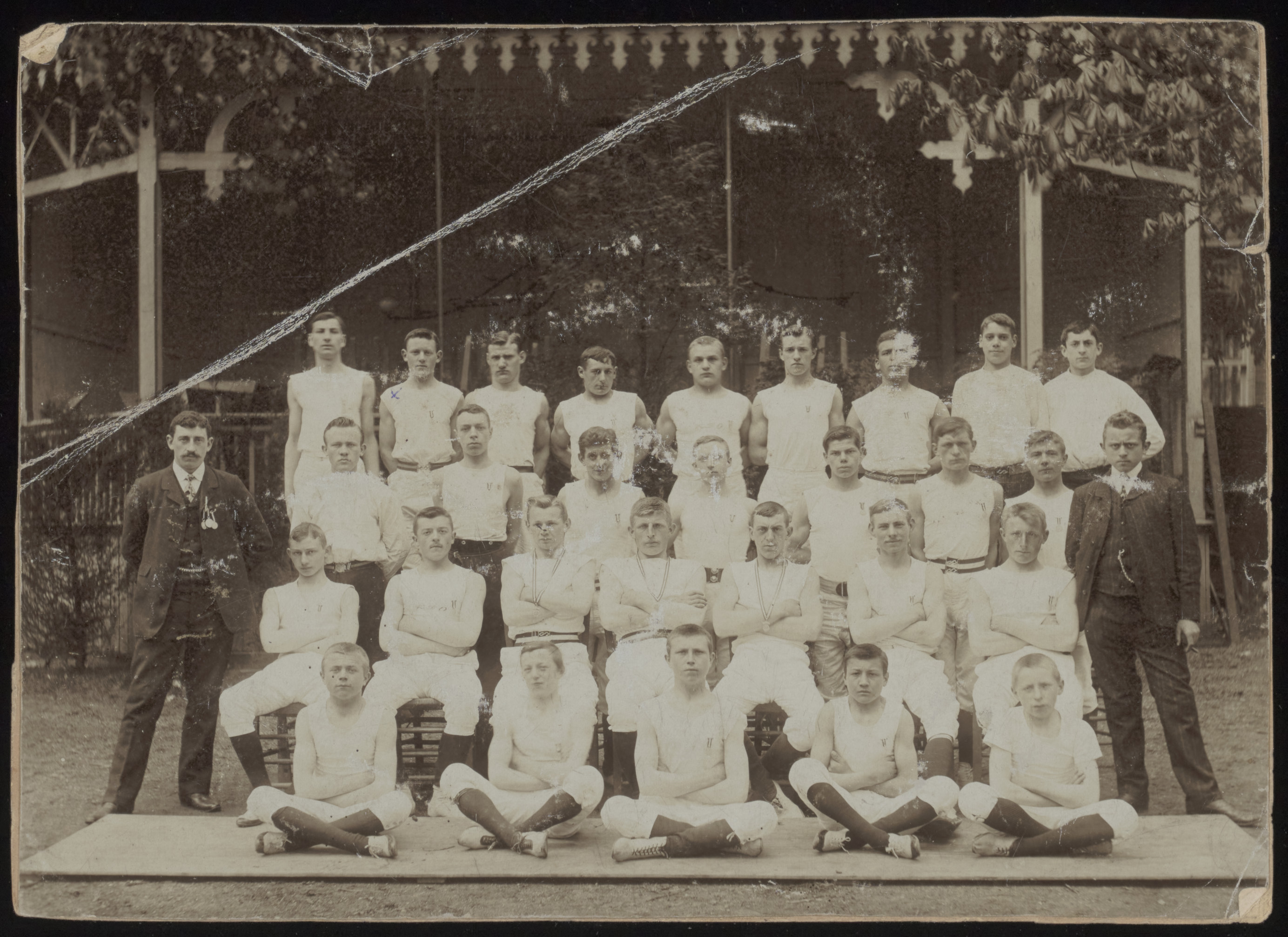 - Groepsportret van de leden van krachtsportvereniging Hercules voor de muziektempel op het Musis Sacrum-terrein aan de Burgemeester de Raadtsingel.
