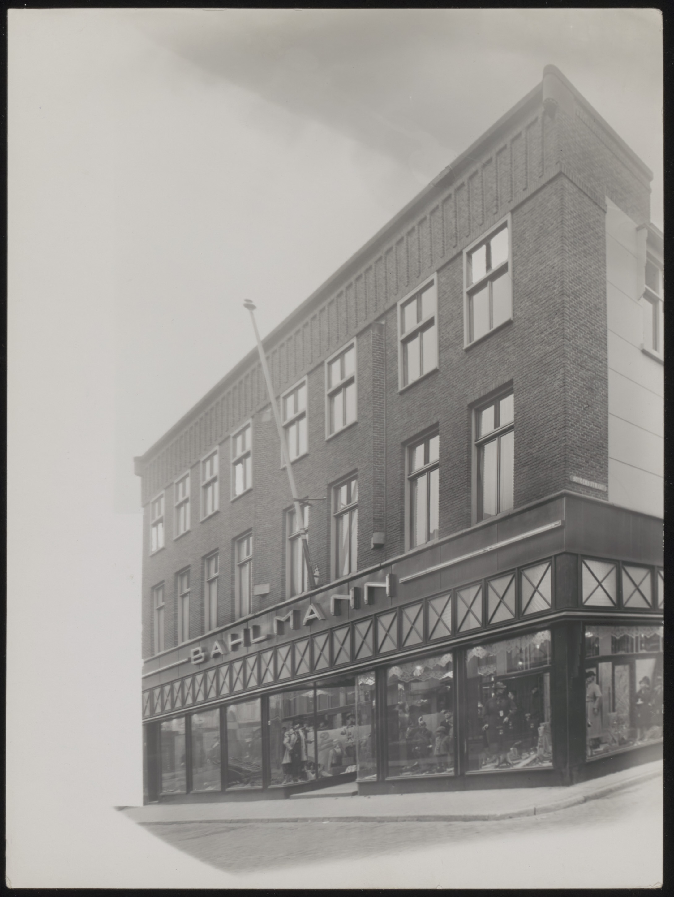 Modehuis Bahlmann op de Voorstraat, hoek Botgensstraat (rechts).