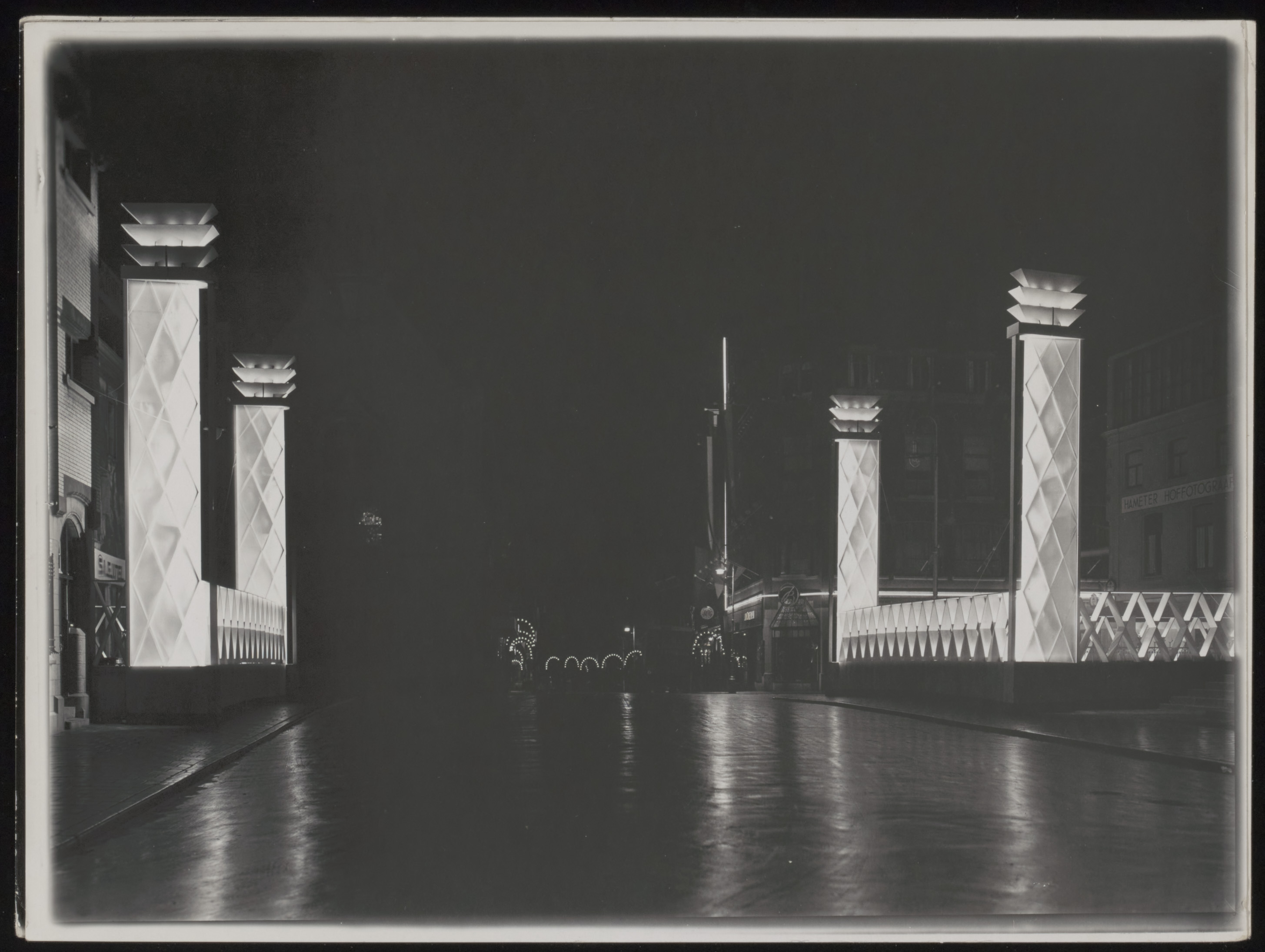 - Geïllumineerde Visbrug t.g.v. de opening van de Zeehaven in 1930, gezien richting Visstraat/Bagijnhof.