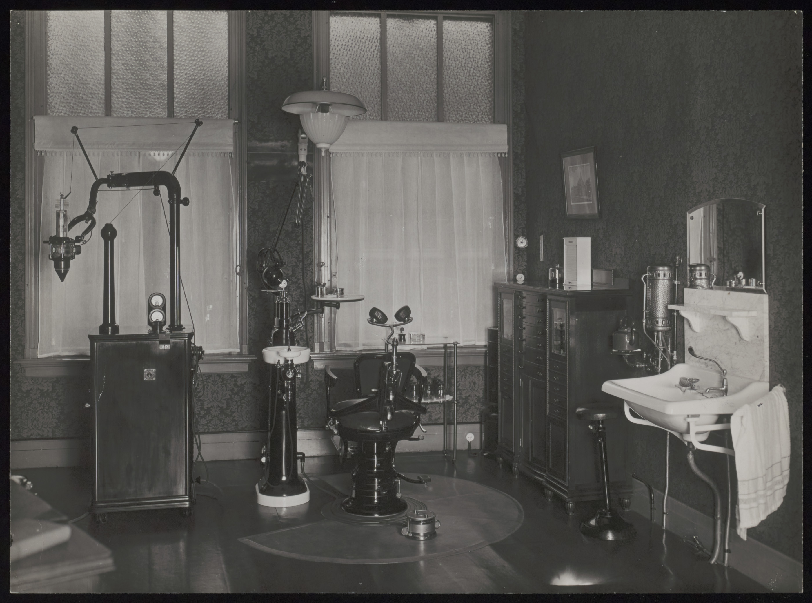 De stoel is volgens mij een Ritter en van Amerikaanse makelij welke van ca 1930 tot 1940 werden geproduceerd. Die 'trommel' op de grond is een deel van de bediening van de stoel. Zoek op Pinterest b.v. naar" ritter dentist equipment". Ik denk niet dat we er nog achter gaan komen van wie en waar, maar wat is mij i.i.g. nu wel duidelijk:"Een moderne uitrusting voor de tandarts anno 1930". ;)