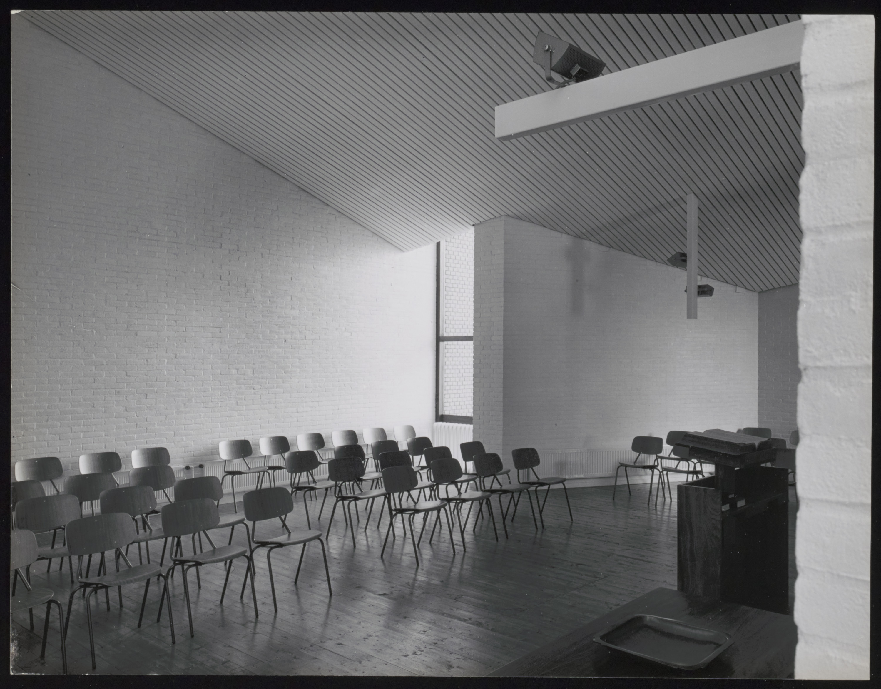 - Interieur van de doopsgezinde kerk aan de Hugo van Gijnweg.